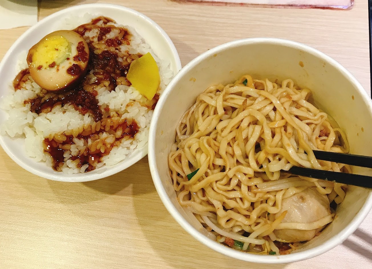 份量少,乾麵付附的蛋根本是外面沾過醬油的水煮蛋,裏面純白無味,雞燥飯雞絲也蠻少的