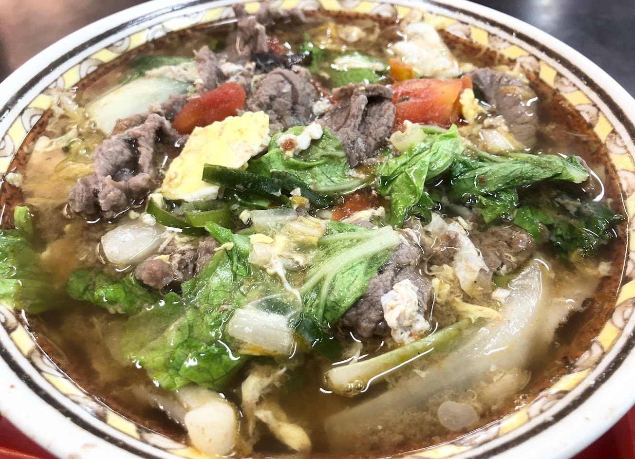 推番茄煮跟酸菜牛肉,兩者都是現點現做,番茄煮會加入大量的番茄,因為是現做的關係番茄口感還在且帶有濃厚番茄味道;酸白菜的酸味則是將牛肉湯的味道更加提現,兩者都會在煮的過程加入牛肉片,所以牛肉不會吃起來太硬反而帶有很好的口感。此外愛吃辣的人因而也推薦加入他的辣醬,可以將牛肉湯的味道轉換成更豐富的滋味。