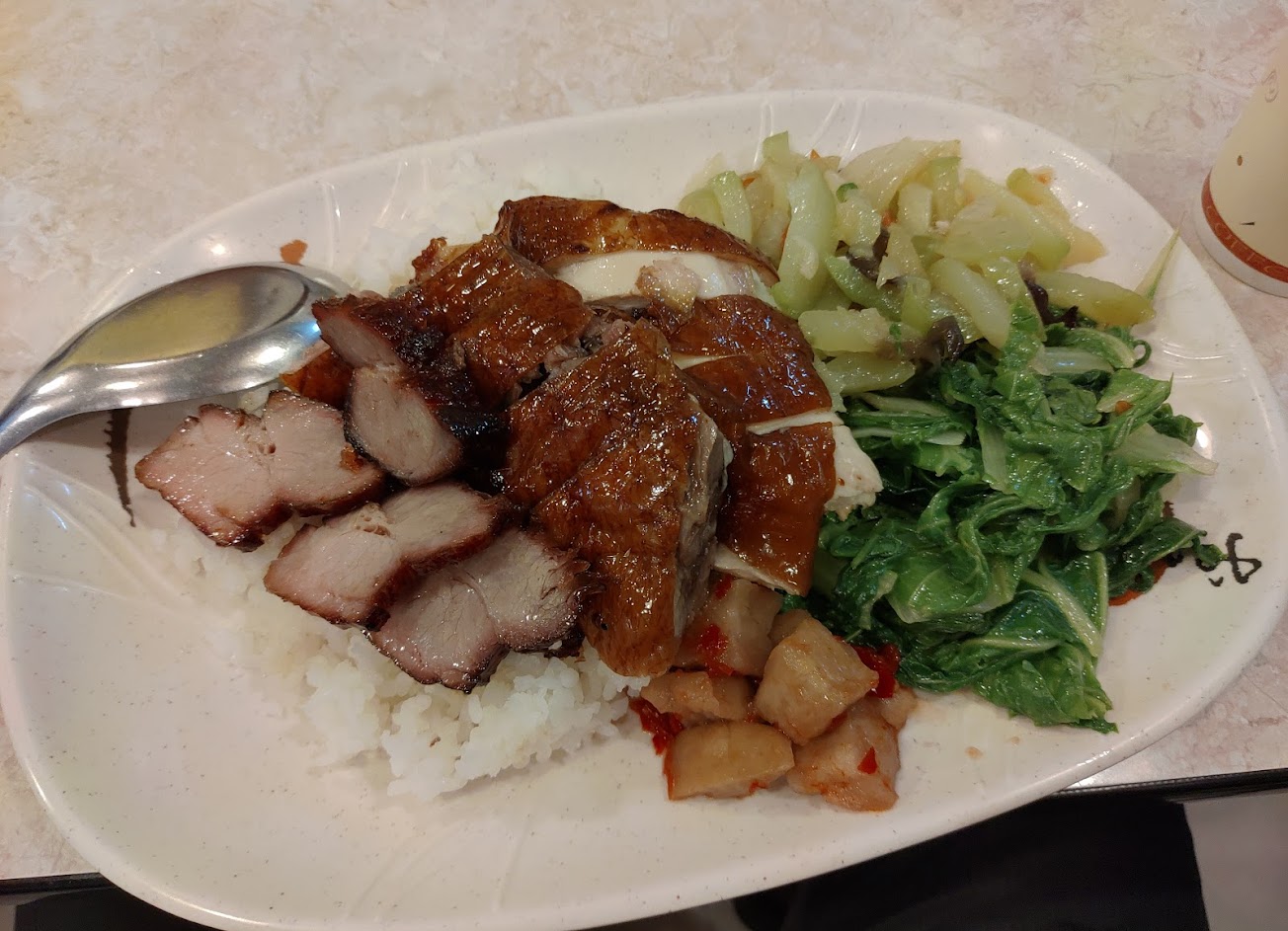 還蠻好吃的,但很不喜歡店家依照客人外貌或性別判斷,直接把客人的飯減量,問都不問客人。看我的樣子就認定我飯要少一點,還被我聽到&看到把飯撥回鍋裡,請問怎麼知道我吃不完?問一下應該不麻煩吧! 當然我也直接告訴店家我的飯不需要減量而且我吃的完,我還吃很多!店家也笑笑說吃不夠可以加飯,但當下感覺真是不舒服。 燒肉、鴨肉、叉燒很好吃,油雞只能吃腿,腿以外的都蠻乾。