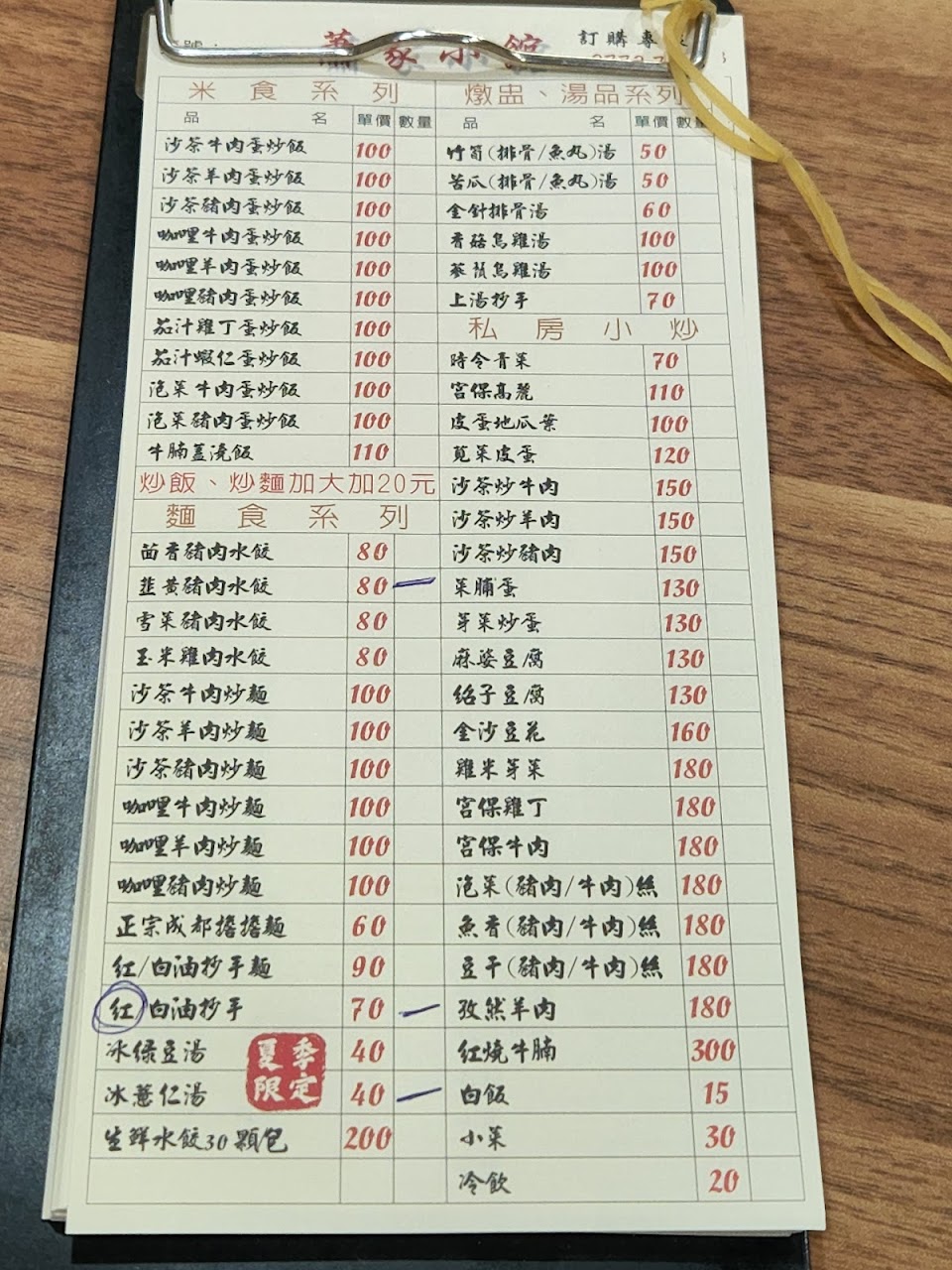 一打開店外訂單的人一直來一直炒,我點了沙茶豬肉炒飯、芽菜炒蛋、皮蛋地瓜葉跟正宗成都擔擔麵。全部餐點都剛剛好,而且才漲十元太棒了!!!