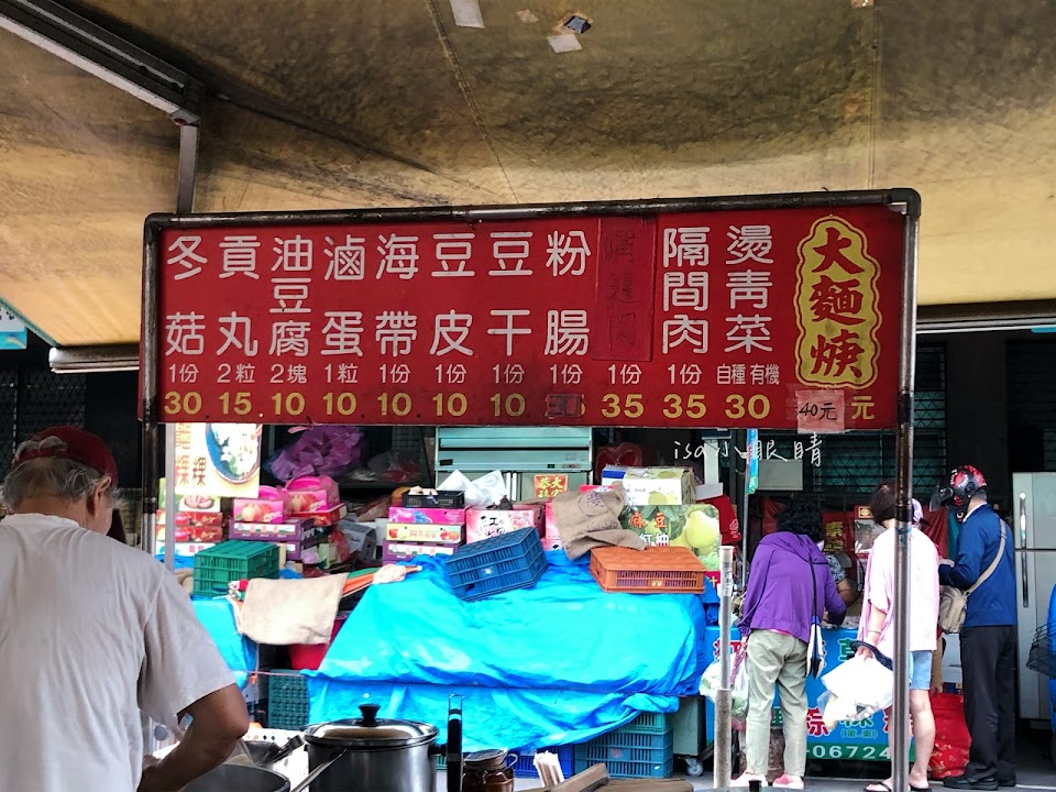 台中才吃得到大麵羹,這裡靠近市場入口處,有時候會來吃一碗。這裡的湯比較不濁,但我個人比較喜歡濁一點的口味。 滷味便宜好吃,可以點一些。 記得要加東泉辣椒醬才是正港的台中味。