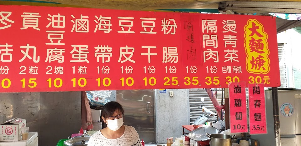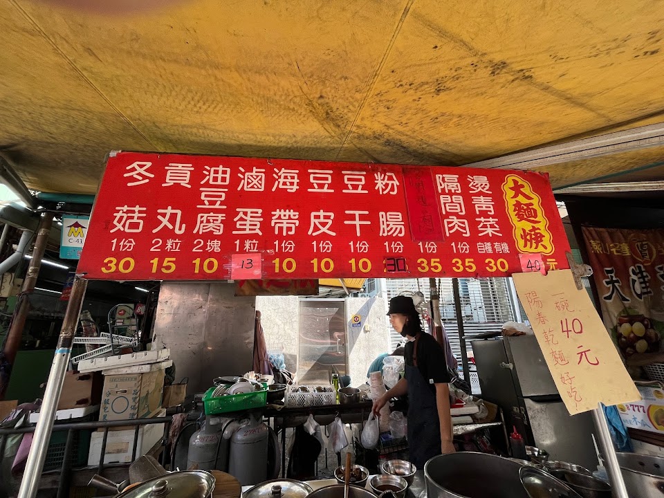 第三市場小吃攤。也是好吃的大麵羹。經濟實惠,服務親切。豆乾海帶一份7元,貢丸還可以買單顆5元。不像有些小吃都是一大份30,光小菜就比主餐貴,單人用餐吃不完。這家一人吃份量剛剛好。