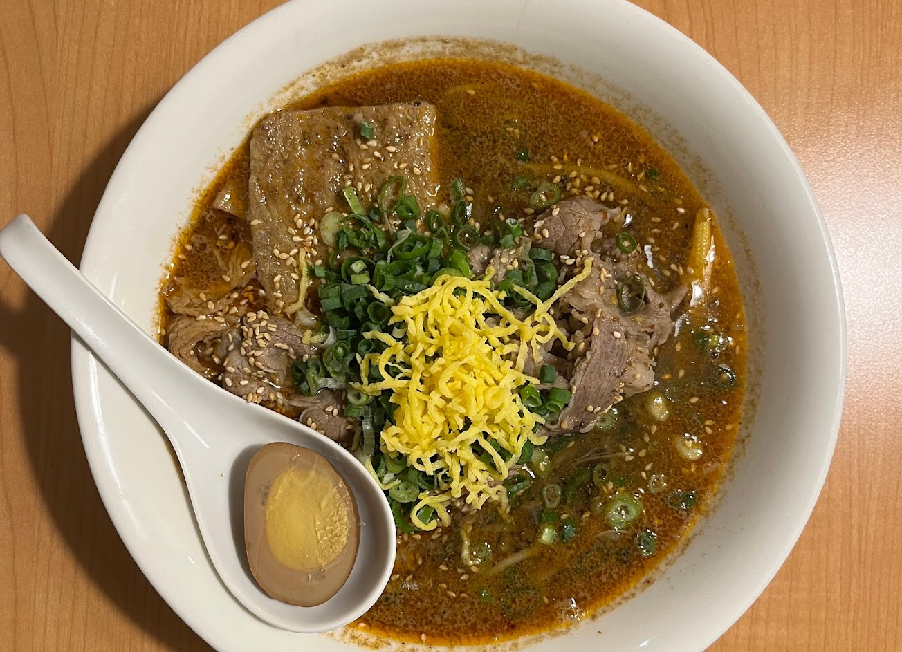 印象是湯頭濃郁,不太死鹹,肉量和蔥花給的大方,但稍微油膩,整體搞得很像日本拉麵。吃得出來手法很多(不是手路),可以試試看!