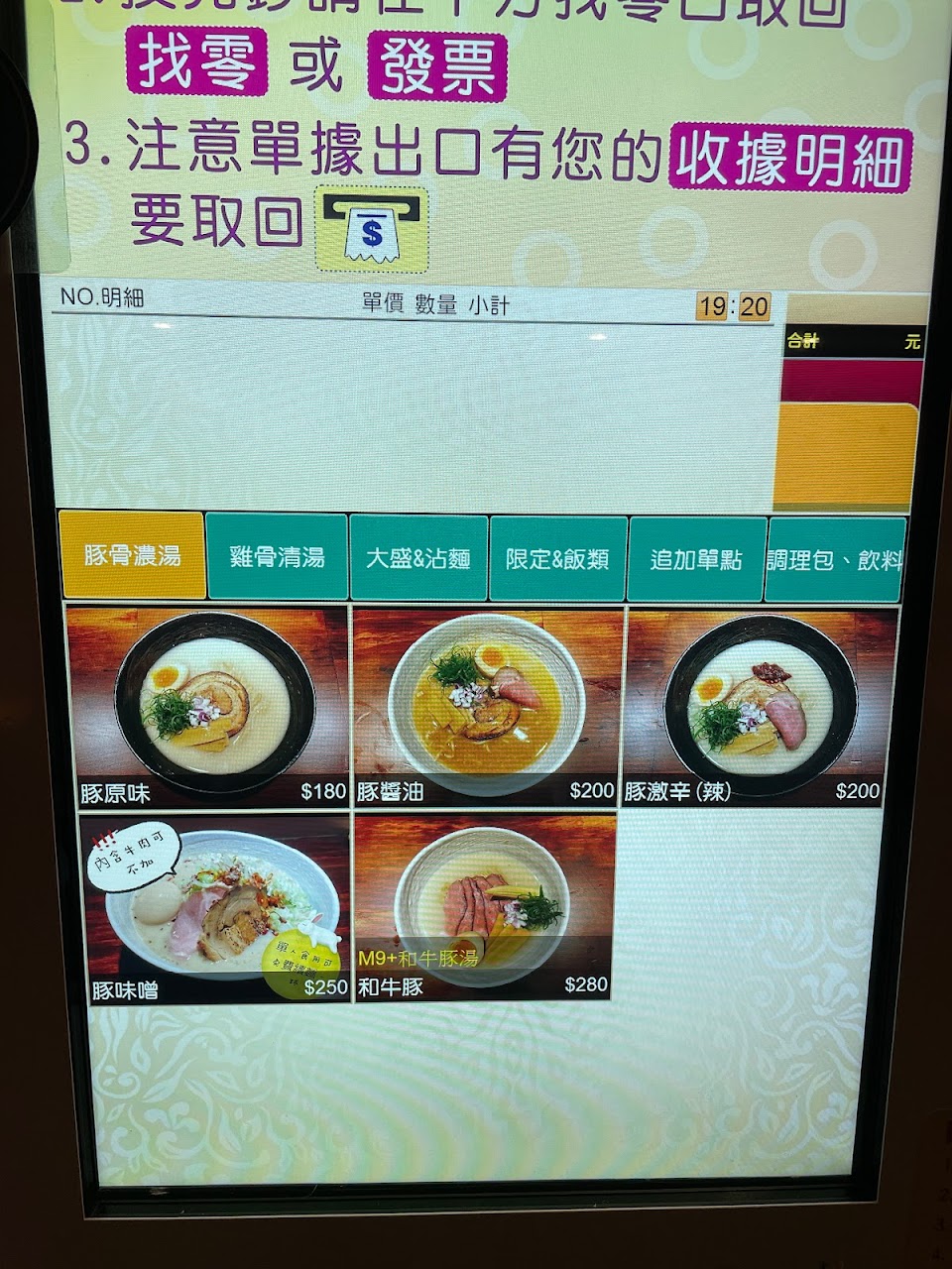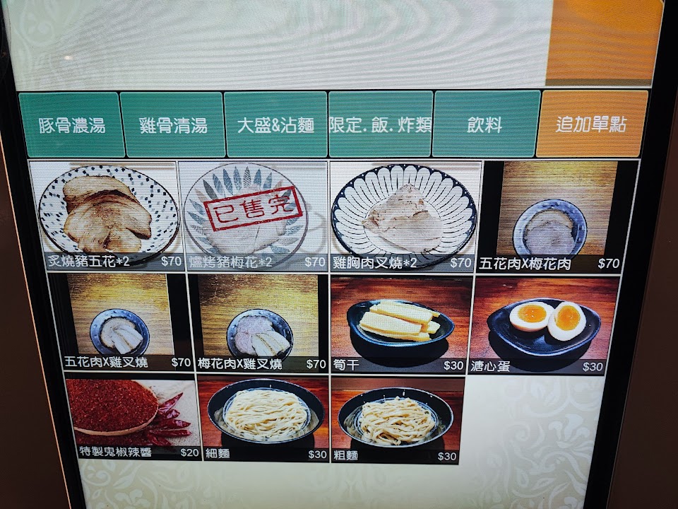 拉麵總類分為基本與大盛款,額外增加每月限定款。湯頭分為豚骨與雞骨,如果已經習慣台式口感的,建議雞骨湯當作入門款,畢竟該店的豚骨是屬於濃厚豚骨(湯比較稠)。