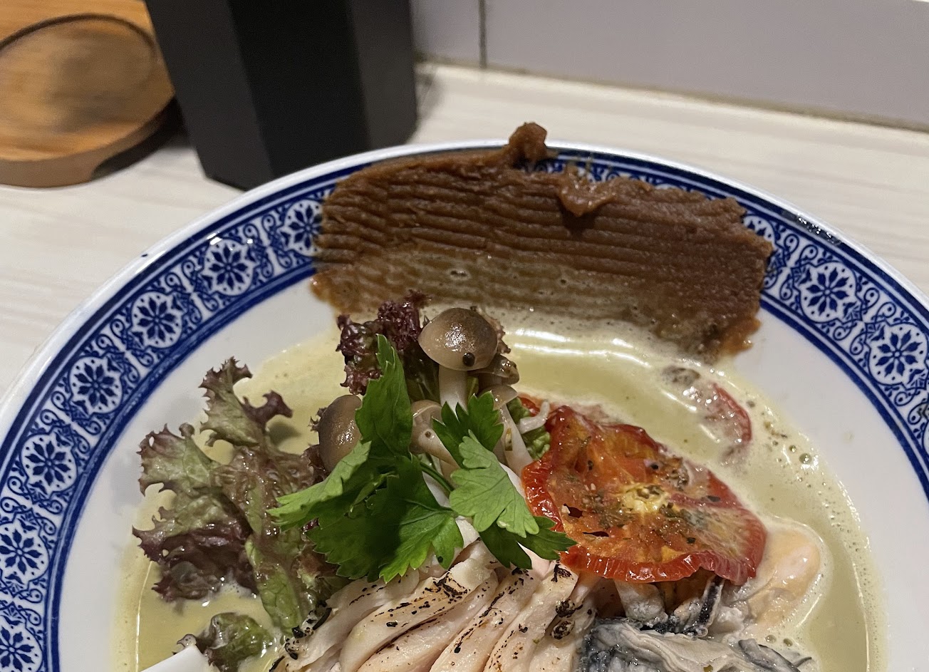 今日點的是日式醬油湯頭,沒有到非常鹹,不過跟台式比的確是有鹹;肉質的雞肉有舒肥過,最上層因為要炙烤所以有留一點皮,口感會有皮的嚼勁,加上舒肥的嫩,很難形容的特別…怪~