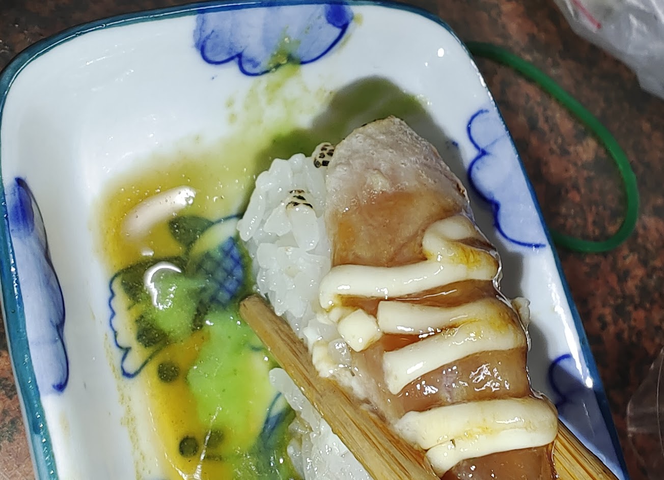 但是送來的餐點⋯看顏色就不是鮪魚⋯然後也沒有芥末跟醬油? …