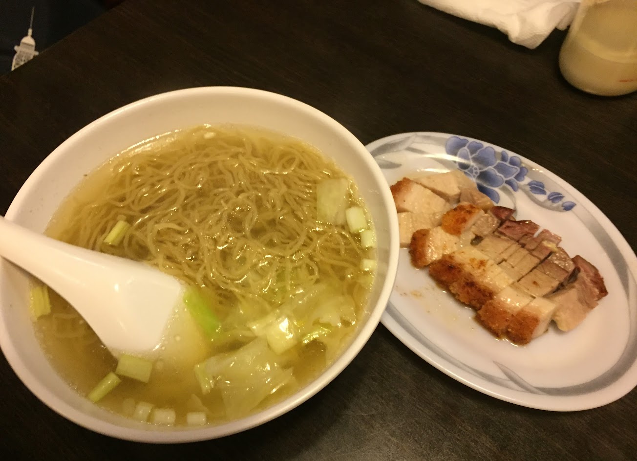 點飯有附湯,有點像是熱水,平淡無奇,油雞和叉燒沒有特別出色,跟其他評論裡形容的差距頗大,肉的份量較少,叉燒跟油雞都滿乾的,切的也大小不一,服務也是港式的服務:特別的差。 再說說腸粉,也是沒啥出色,蝦子本身沒彈性,腸粉也是沒咬勁,還有點乾,而且還是溫的。慕名而來有點失望,大概就是個填飽肚子的地方。