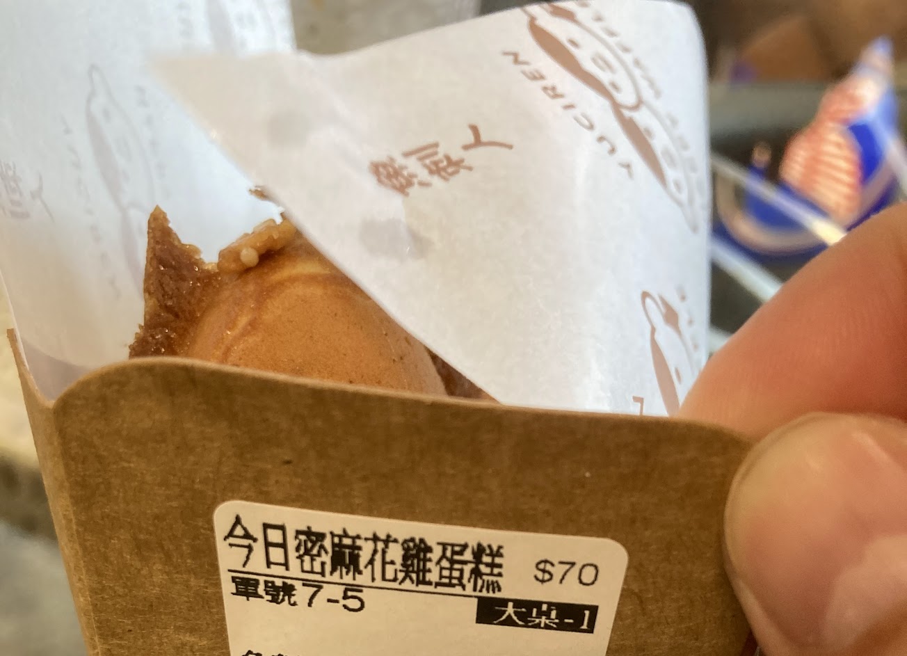 外帶的盒子就是這樣的坦蕩蕩,雨天一手拿傘一手托砵,請老天爺洗淨我雞蛋糕的罪孽 有和店員示意是否能多要個盒子蓋住,店員反應奇快的將墊雞蛋糕的包裝紙闔上貼上膠帶,一看就知道不只我反應,這樣做就可以省一個包材了?如果是擔心雞蛋糕悶住軟掉可以參考一下章魚燒的盒子,不忍說膠帶真的蠻廢 蜜麻花口味的口感奇異,我本來很愛今日蜜麻花買過無數次,但包在雞蛋糕裡實在詭異,濕濕熱熱軟軟和偶爾蹦出來的白芝麻味與雞蛋糕實在不搭,唯一好吃的地方就是邊邊脆脆的很像煎餅