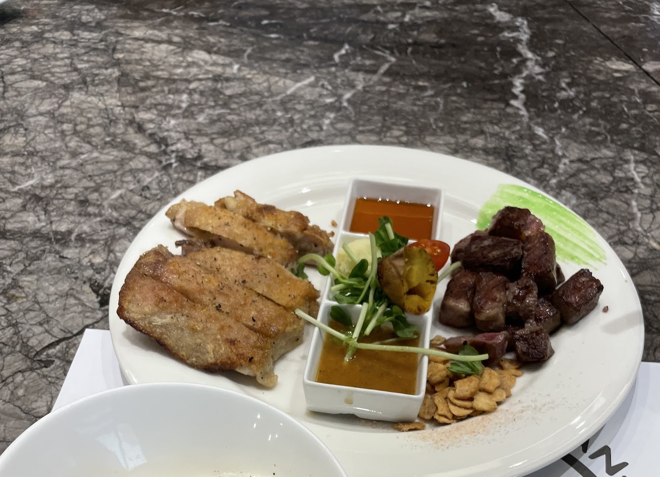 滷牛筋還算好吃,但裡面的小黃瓜是後來丟進去的,沒味道;商業午餐的牛排還可以,盤子裏的配菜-豆芽菜是涼拌的,完全沒有味道?