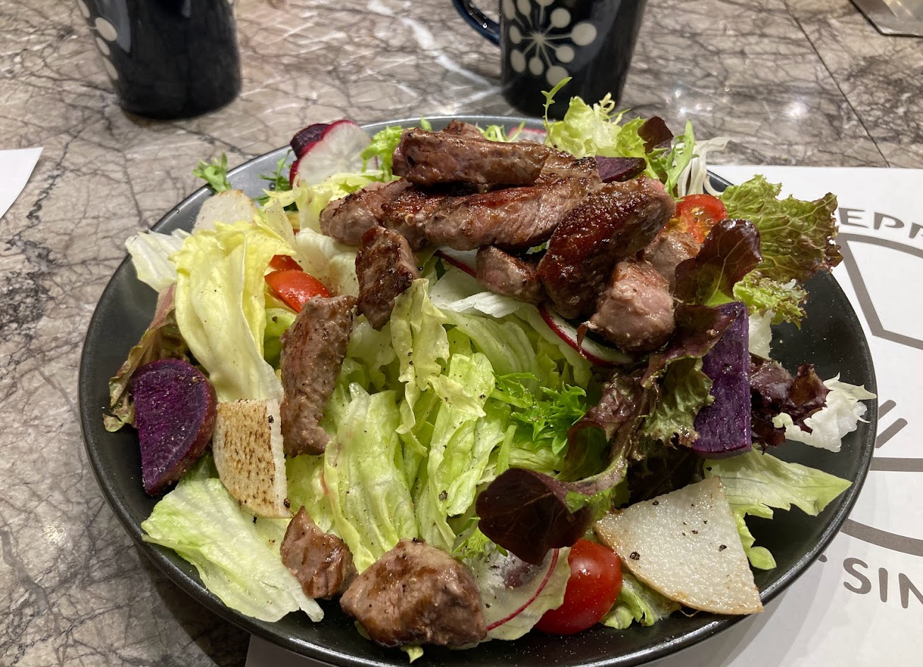 沙朗牛跟煮牛腩很推薦,雞腿排也不錯,炒高麗菜普通,甜點奶酪比較好吃。