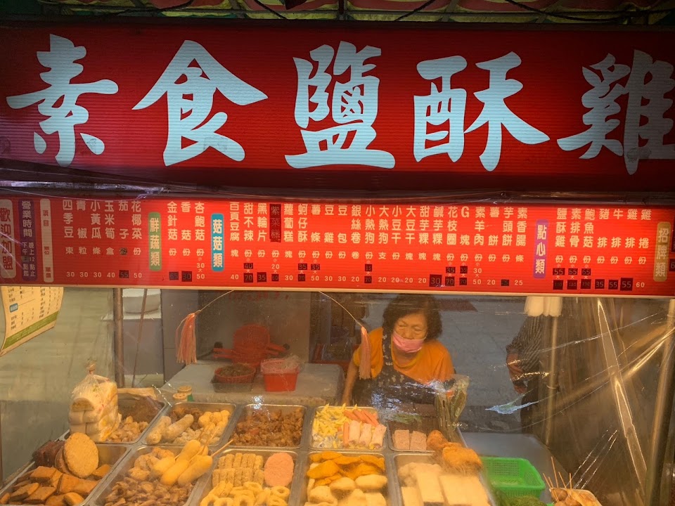 位於夜市偏末段的小攤,老闆娘常常會待在裡面休息,需要叫她出來,有時可以自己夾取商品,在炸完後老闆娘會用調味粉灑上,有時會直接用罐子觸碰食物,幾乎所有食物都會被塞進同一個紙袋裡,拿到食物的同時再買單給老闆娘,製作速度普通。