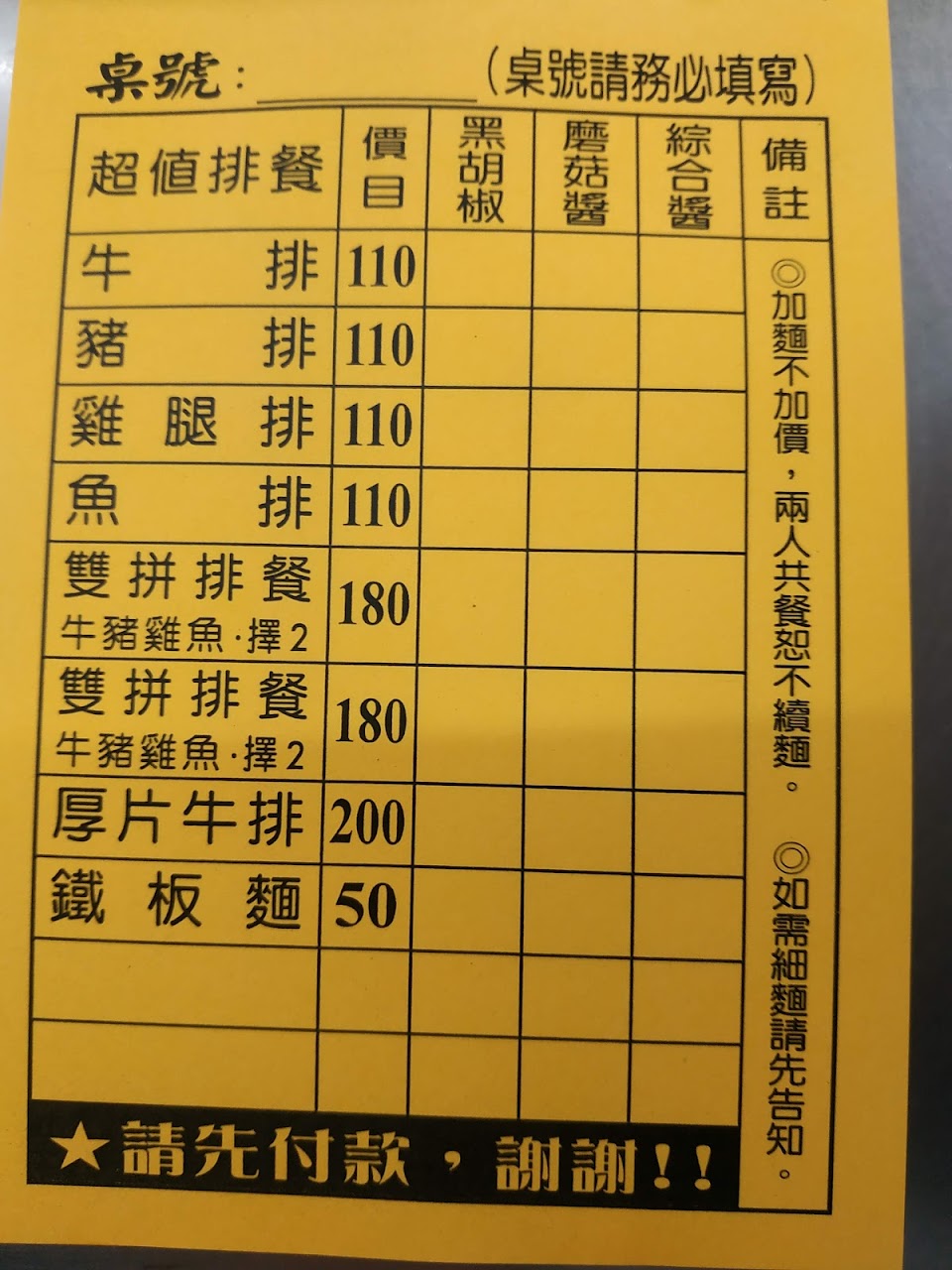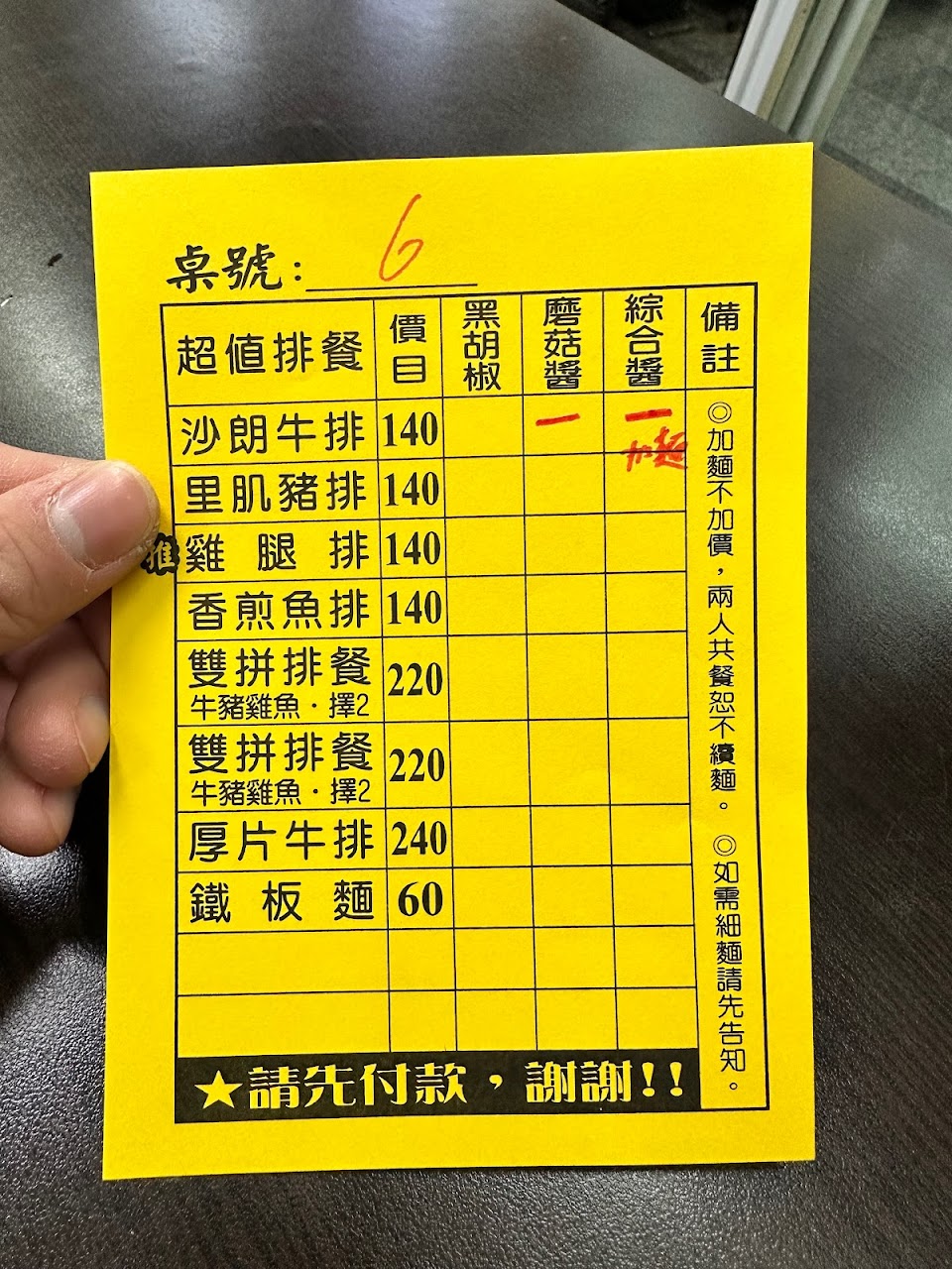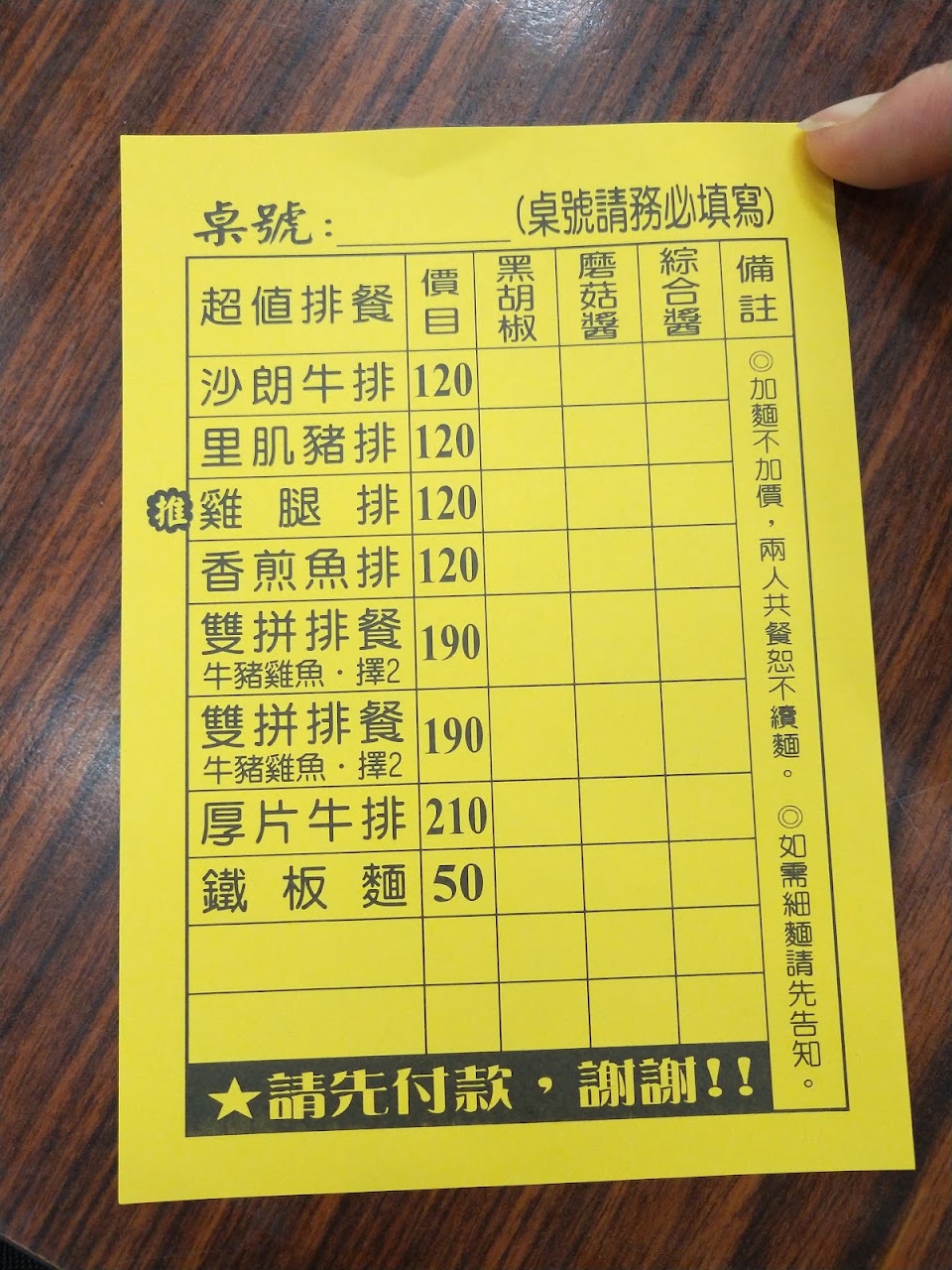 今天的男店員不但臉色不太好,也沒有打招呼 ,更要求一定要自己畫單,也沒有告知加麵不用錢,點餐後也沒有給予號碼牌,餐點做好也不會通知客人取餐,商品售價還調高20元,目前售價為150元