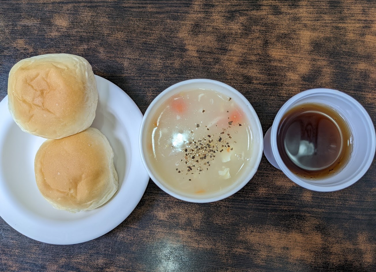 我是外帶鐵板麵,阿姨也很熱情的跟我說濃湯、飲料自己都可以包,並提醒我盛湯用架上的鐵杯盛才不會燙到!餐包可以夾兩顆,經過的一位大哥還跟我說餐包下午送來的,還軟軟的,也可以用烤箱烤一烤會比較酥~