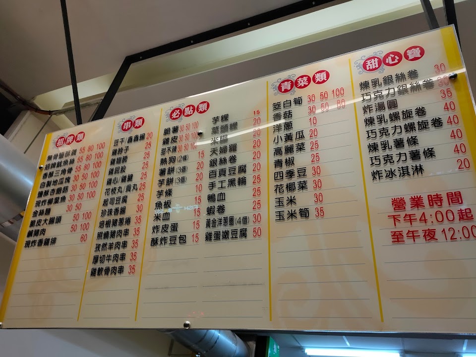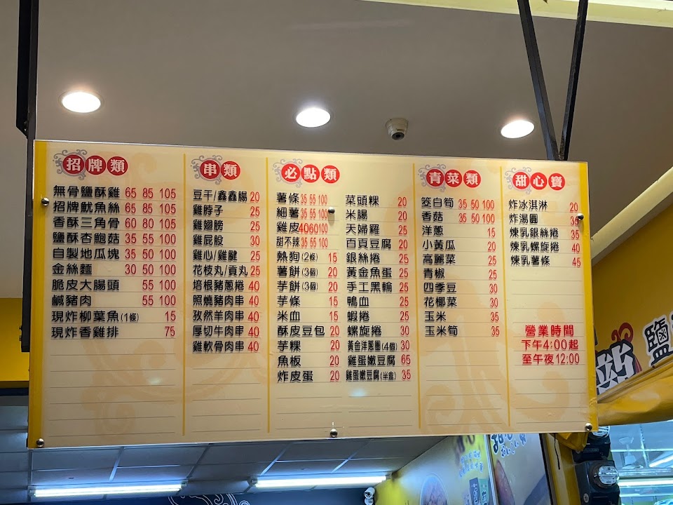 鹹酥雞、魷魚、百葉豆腐、米血、甜不辣、豆乾、貢丸、青椒、香菇