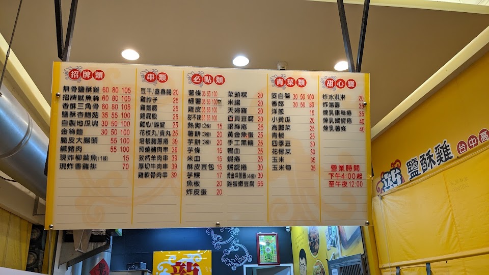 鹹酥雞小份$55/鹹酥菇中份$55/四季豆$30/豆包$15/黑輪$25)