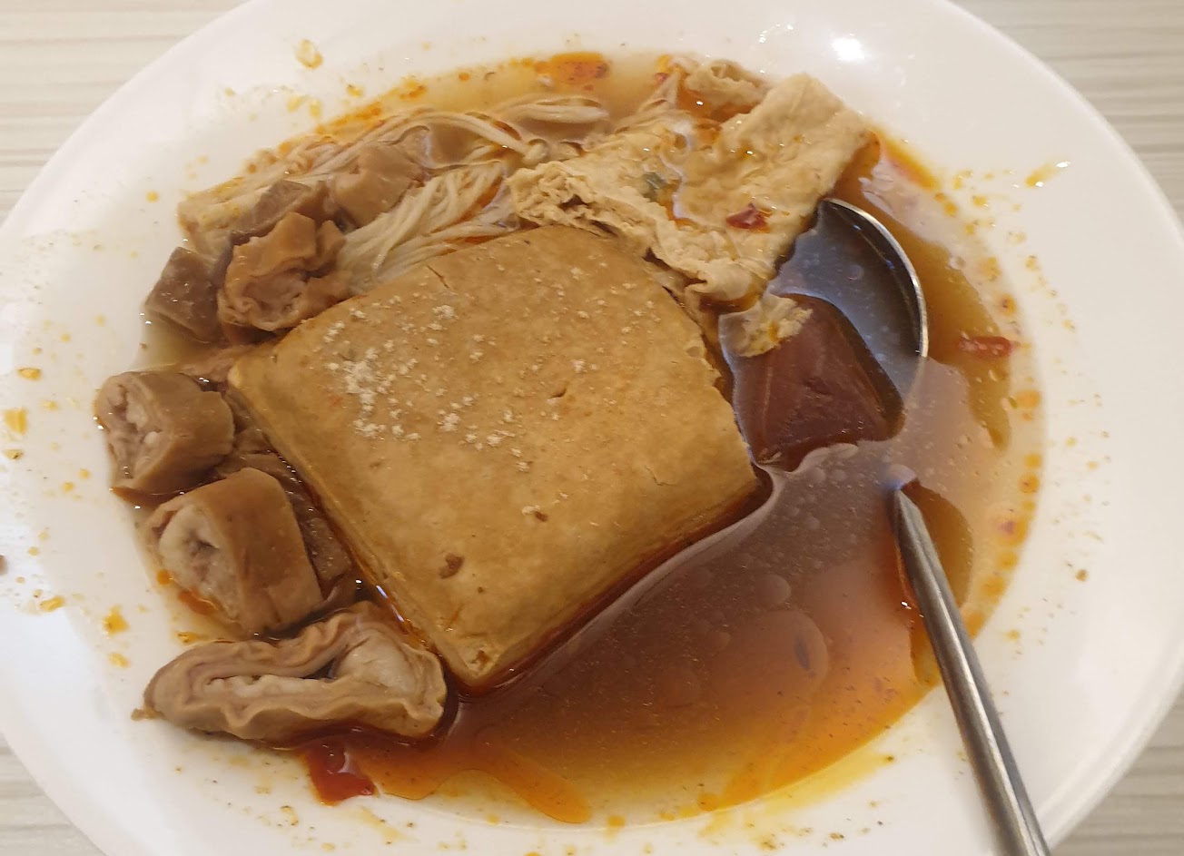 大腸豬血湯-清爽型湯底,風味普通小碗,還好可以加湯,$70太貴。 餛飩乾麵-餛飩很小顆吃不出鮮美,乾意麵調味普通,需加辣椒醬與黑醋調味才好吃。 肉圓-內餡竹筍與豬肉鮮美,但外皮太厚,內餡與外皮強烈分離感。