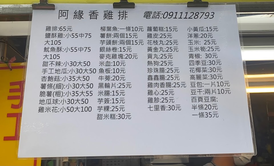 雞排、鹹酥雞、魷魚腳 超好吃~~~ 老闆娘人很好唷! 從他們在蔡家豆花對面吃到現在 回娘家必買的阿緣! 建議先打電話~ 生意很好想吃美食要好好等待 服務 外帶 餐點類型 晚餐 平均每人消費金額 $200-400 建議的餐點 雞排 鹽酥雞