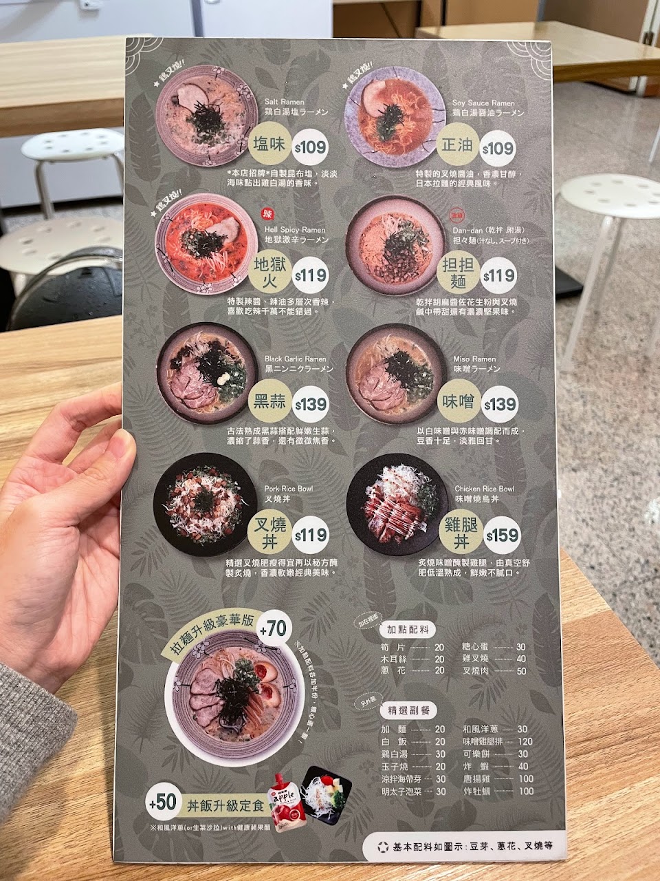 鹽味拉麵還不錯,會附一片雞叉燒。學生證可以免費加麵一次。