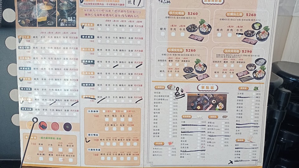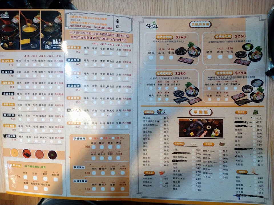 麻辣鴨血 涼麵與生菜沙拉 起司牛奶鍋 田園蔬菜鍋 味增 海鮮鍋 蛋餃 泰式酸辣海鮮鍋 豬肉片 西北爆漿起司燒 酒香麻油海鮮鍋 鯛魚片 札幌味噌海鮮鍋 海鮮札幌味增鍋 豬油 拌飯 藥膳鍋 奶油爆米花 沙拉吧的食物 飲料