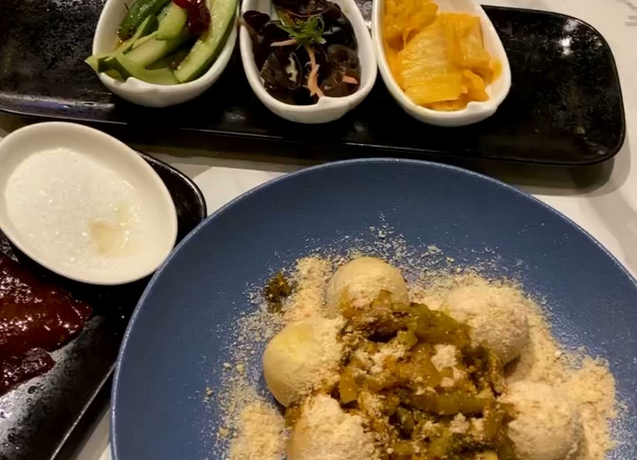 烤“櫻桃鴨,肉質很棒,沾醬與蔥段都很貼心裁切。麻油菠菜口感很好麻油薑絲味道很棒。蒜炒水蓮味道很濃香,口感脆甜。酸菜鴨湯,湯頭,酸而不膩,後勁帶來椒麻。黃金泡菜酸中帶脆甜而香辣,應該是7 Hot同款的。涼拌木耳脆爽托出麻辣尾韻。鴨三寶也很貼心,鴨翅已經分半,更好啃食,鴨胗軟中帶Q,滷味香四溢。香辣小黃瓜真的很不賴。豬肉炒烙餅條,鹹中帶香。唯一美中不足鴨頭鴨脖沒有處理乾淨在鴨毛,影響口感。一隻全鴨,甜麵醬只有一包,真的不夠。還有酸菜鴨架湯如果湯可以再多一倍,用餐才能滿足。