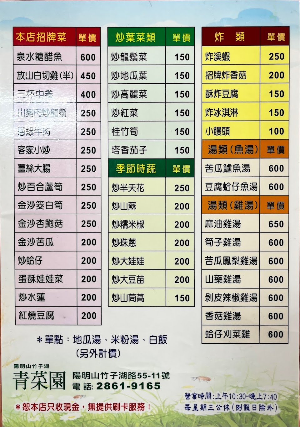 帶退休同事來七星山看芒花,可惜天氣不穩定,又有點冷,決定來去竹子湖吃午餐,首選到青菜園,點了放山雞肉、龍鬚菜、三杯中卷等,除了白飯也要喝一碗熱熱的地瓜湯,上菜快速又美味,大家都滿意!
