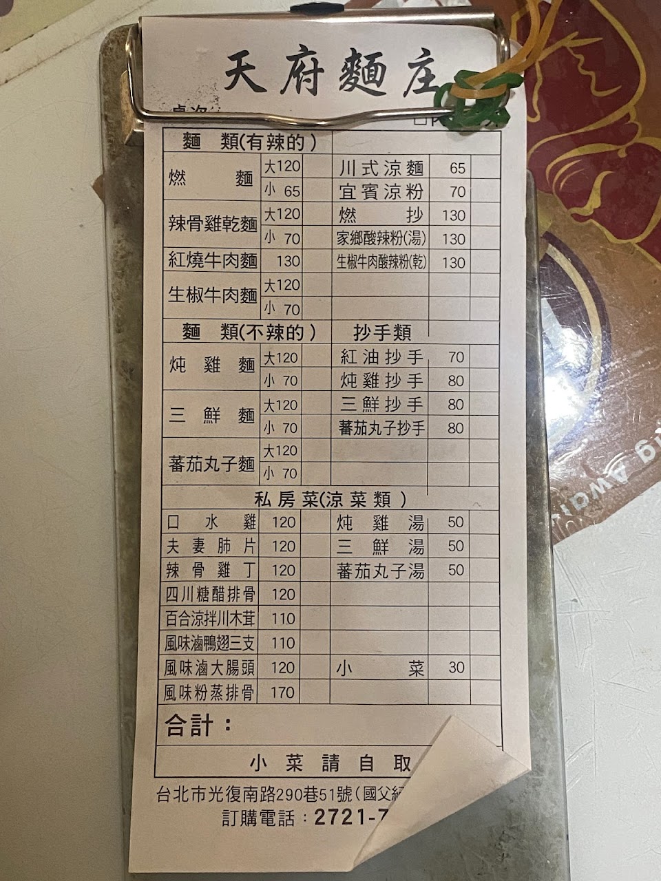 「天府麵庄」藏身在國父紀念館週邊巷弄中的一爿小店,店面不大,內用僅有三張四人桌以及兩張雙人桌,座位不多,用餐時間很快就會客滿,因此來這用餐是很講究緣分的(對的時間、對的人、才吃得到?)。店面由一對夫妻打理,通常外場點餐與煮麵的都是台灣老闆,但是店裡真正的一把手和店家的靈魂則源於來自四川宜賓的闆娘。店舖本身很像是大陸所謂的“蒼蠅館子”,店內呢沒有華麗的內裝,甚至環境看起來還有點油垢,不過呀味道可是紮紮實實的一極棒,懂吃的你肯定一試成主顧,唯一缺點就是餐點份量少了點,應該是為了讓顧客能多吃幾道菜而貼心設計的吧???。