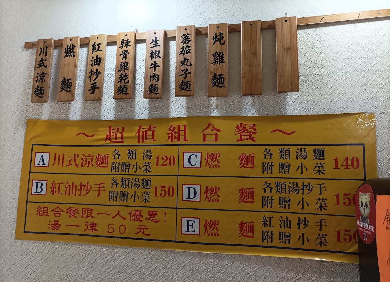建議點餐前先仔細看牆上超值組合餐較划算,今日點了燃麵$65紅油抄手$70燉雞麵$70口水雞$120,條件略符合c餐,但老闆未貼心給予建議,共收$315~320(有點忘了),好像有少收5~10元。
