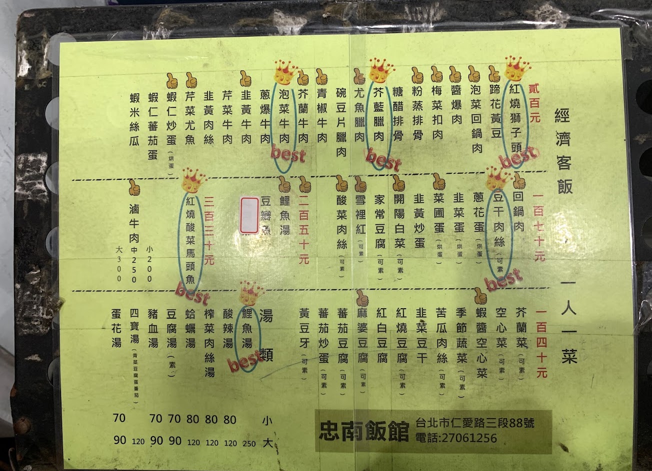 眷村家常菜,上菜速度很快, 幾個人就要點幾道菜, 白飯吃到飽自己裝, 豆芽湯免費供應。 忠南飯館,十年老店,外省菜餚, 中國廣播,贈送匾額,十里傳香, 價格公道,經濟實惠,菜色簡單, 師傅妙手,快炒上桌,味道極好, 帝寶對面,用餐時間,常常都是, 排隊人潮,生意超爆,門口滿滿, 不過還好,換桌快速,不用久等, 找好座位,書寫菜單,交給櫃台, 先去添飯,喝口麥茶,熱菜上桌, 準備開動,菜足飯飽,後會有期。 原本忠南飯館的招牌非常老舊, 經過去年重新裝修後有了新的招牌, 店內明亮許多。 十里傳香”的匾額還是中國廣播公司中國廣播的, 中廣以前就位在現在的帝寶,離忠南飯館很近。