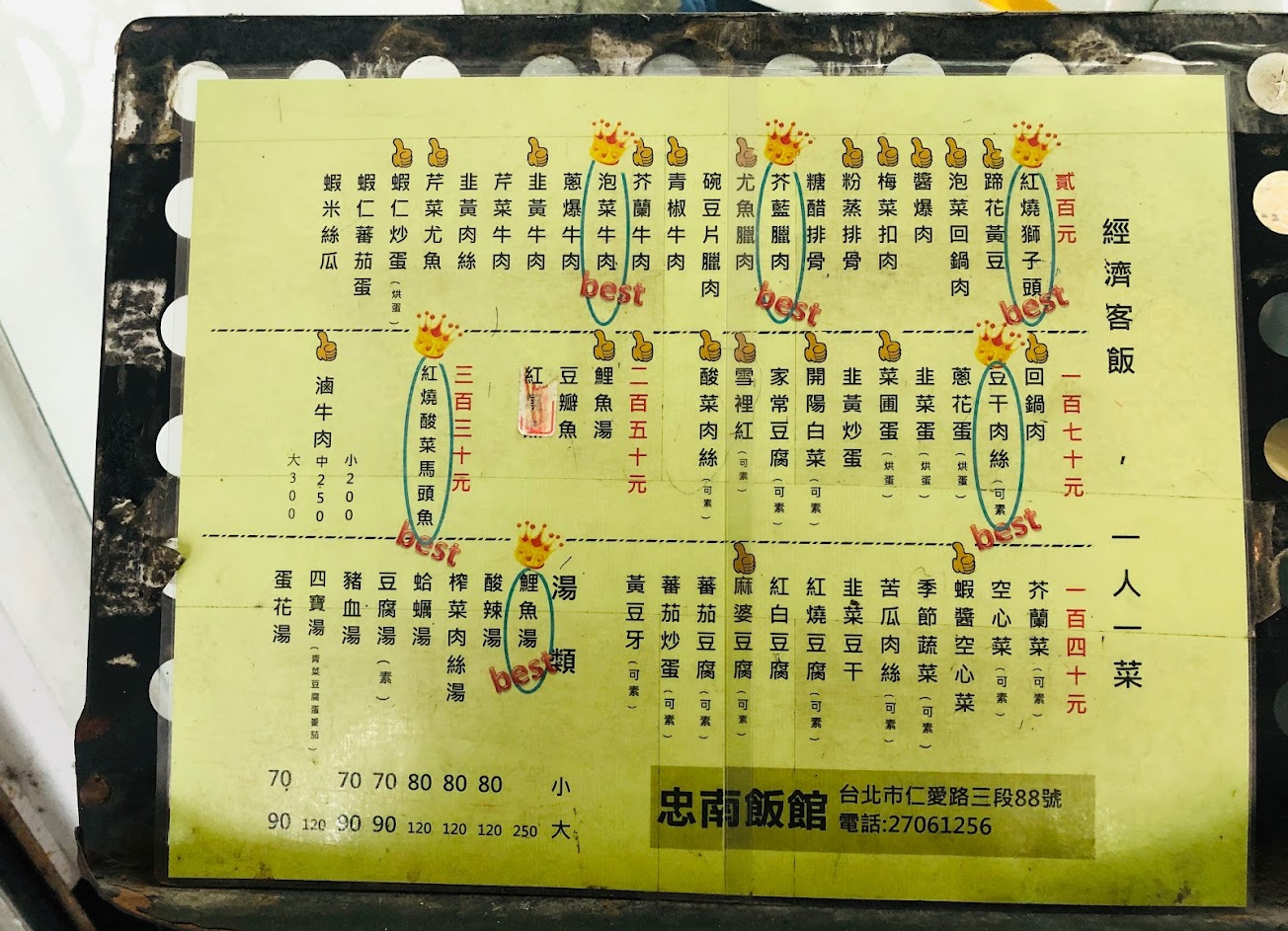 便宜、實惠,口味雖然重了一點,卻剛好下飯。忠南原本就是管粗飽的,嘉惠藍白領不知凡幾。有名的獅子頭、粉蒸排骨等不多介紹,激推馬頭魚(炒酸菜或豆腐)、小芥藍、回鍋肉,好吃!