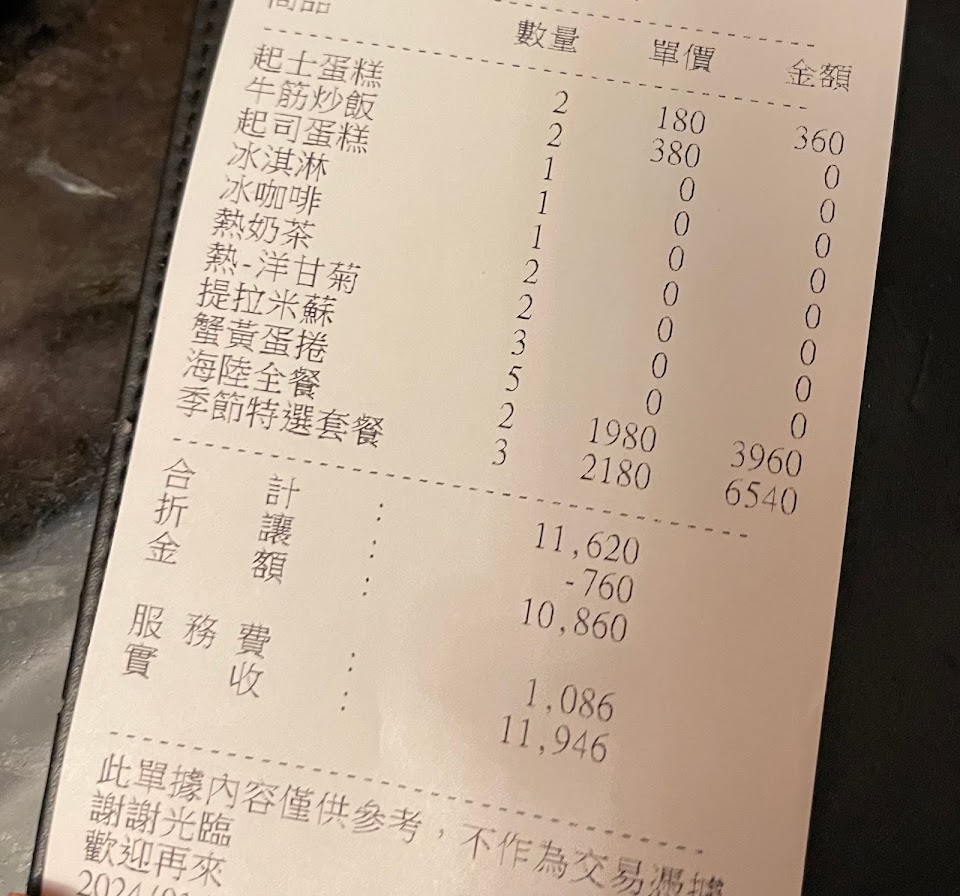 7個人用餐 消費 18xxx 以CP值來說 可能比 夏慕尼還要低,一份套餐大約2500左右但每樣菜色幾乎沒有讓人驚艷的感覺。加上份量也不是很多若沒有五星評論還沒有送最後的炒飯,然後用餐過程僅附上水而已 三顆星給在 服務還算不錯 用餐環境舒適