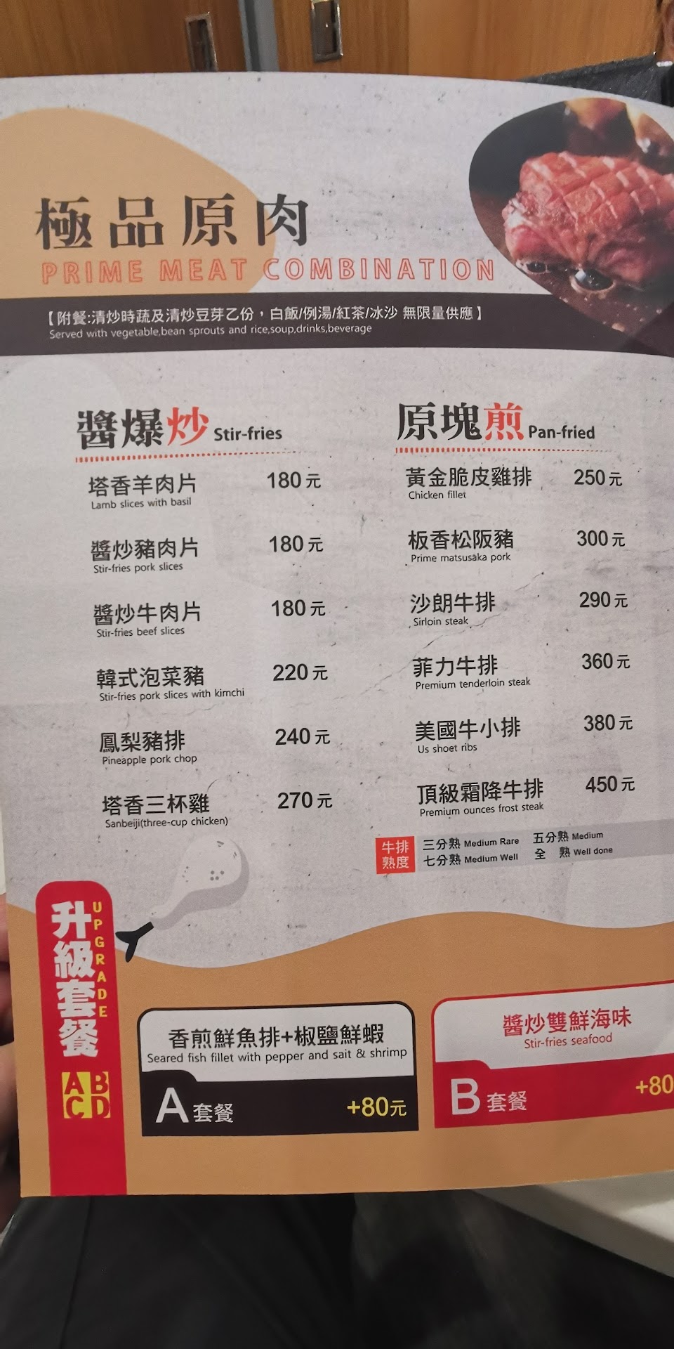 分別嘗試了 沙朗牛排 黃金脆皮雞排 大港鱸魚排 食材新鮮,鐵板做的不錯。