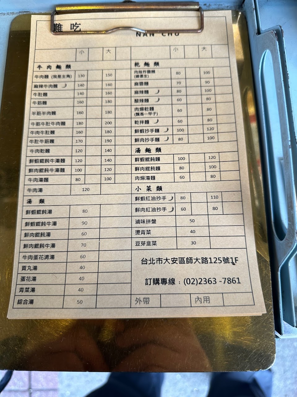 ?菜單品項為各式乾湯麵、湯類及小菜。內用先填寫菜單,麵條有家常麵及細拉麵可選,等候安排位置,完食後再買單。