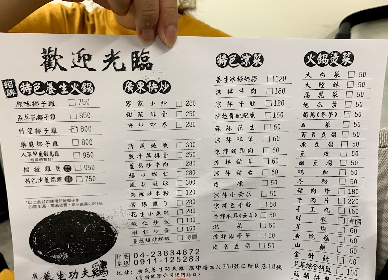 隱身環中路旁田間的廣東風味美食,每道食材都真材實料。蟲草花椰子雞湯剛上桌原汁原味、奶香甘甜,後期經過南瓜、芋頭的熬煮,轉變成濃郁雞湯,營養滿分,大人小孩都喜歡。