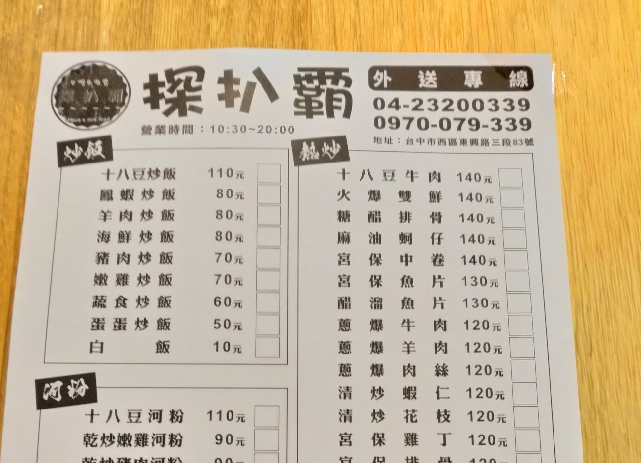 朋友給了三張Gomaji…讓老公去外帶兩炒河兩炒飯…蛋蛋炒飯 羊肉炒飯 炒牛河 炒豬河…每樣味道都很好…牛河比豬河相對來說肉質比較不乾…味道夠…鍋氣夠…也不會過鹹…距離離家稍遠…但勉強算是老公常跑的位置…份量剛好…但胃口大的男生可能會稍有不足…河粉很Q…如能保持水準…會持續回購…
