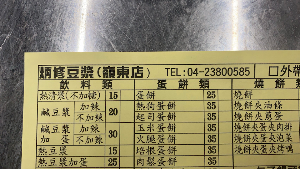 消費餐點:蛋餅、河粉蛋餅、烤鴨蛋餅、湯包、熱狗、蔥蛋