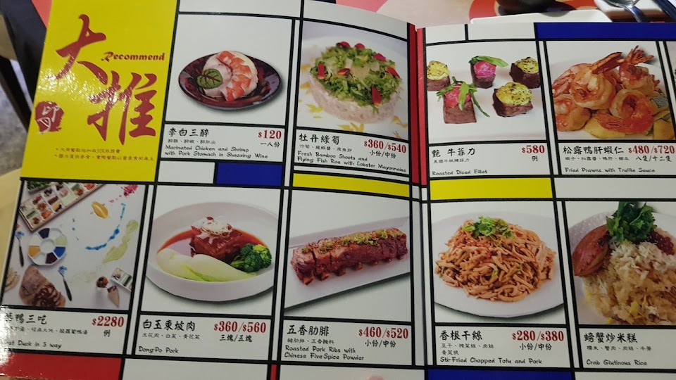嫩煎牛排 高麗菜飯 流瀑金沙中卷 Stir Fried Chopped Tofu and Pork 生魚片 松露滑蛋干貝 杭州難舞鍋 豬肉筍片湯 藝術烤鴨 蔥卷
