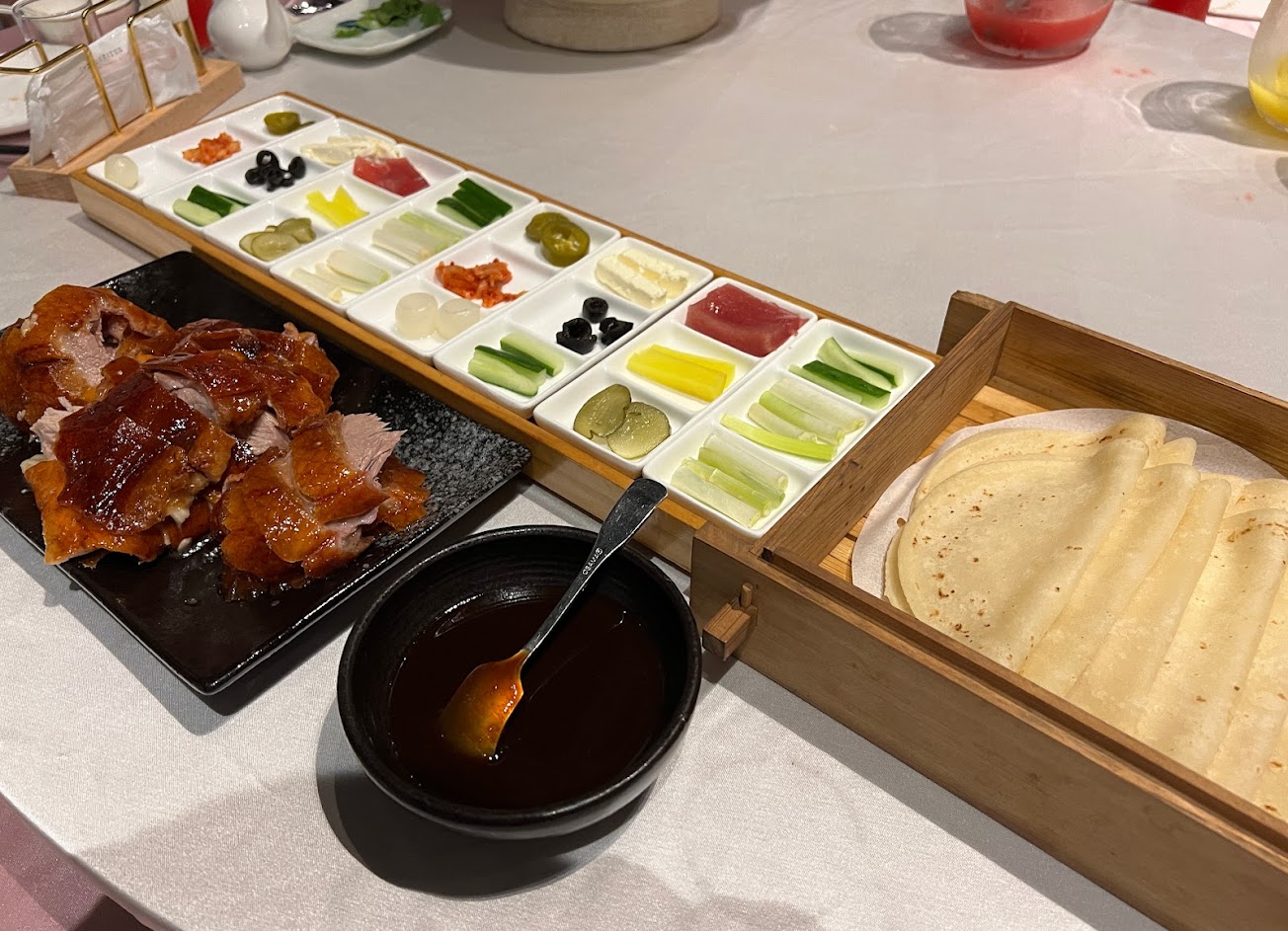 東西口味有點重,烤鴨醬料很多七八種很有噱頭,不過其實也沒多好吃,還是原本的甜麵醬好吃,包烤鴨的黃蘿蔔鹹到一個要洗腎的程度,最好別吃……烤鴨本身是還不錯