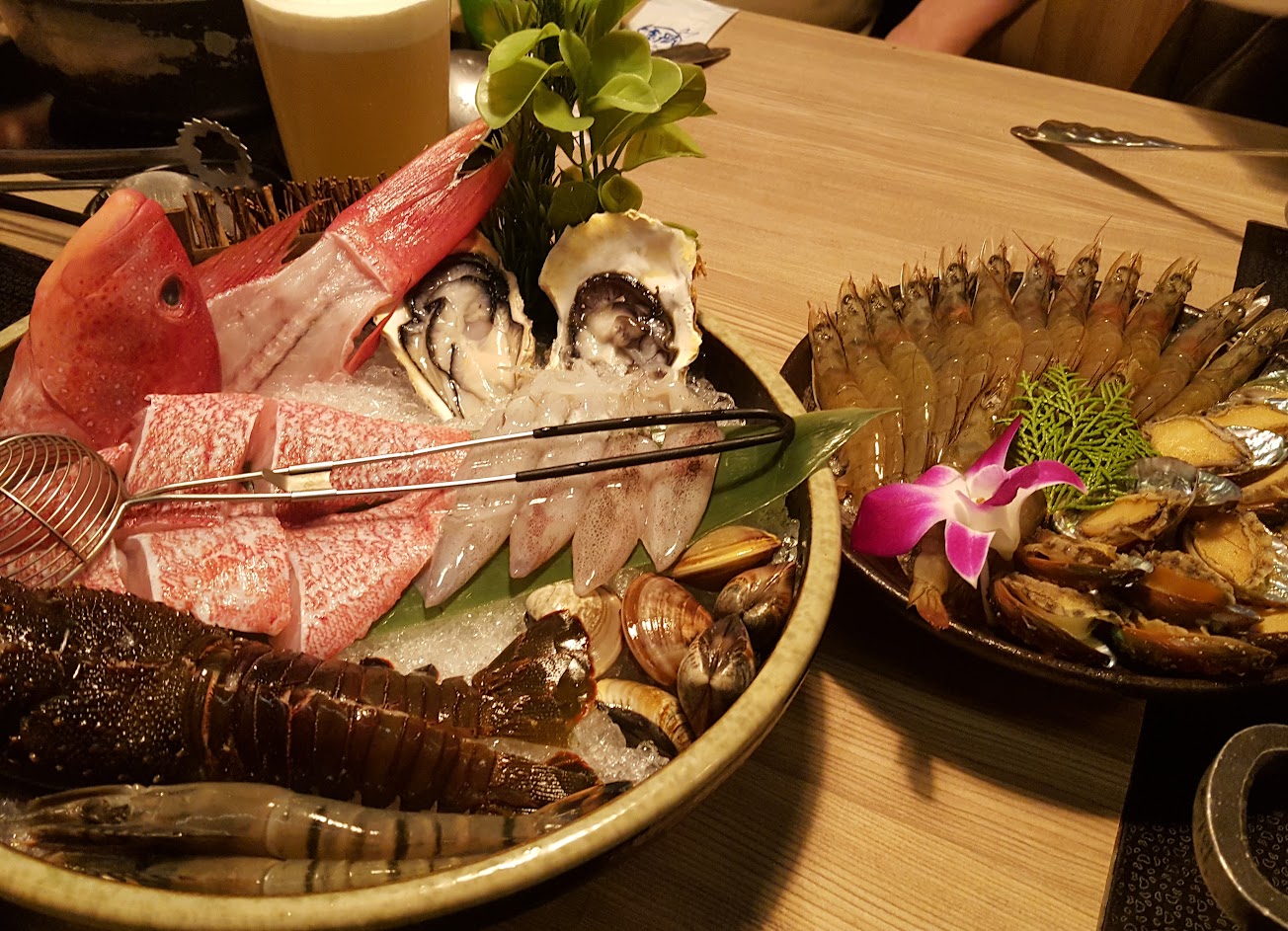當月壽星送歲數一半的蝦,套餐加蝦吃的很飽,湯底我們點了黃金卜卜鍋跟壽喜燒鍋,兩種湯頭都不錯,黃金卜卜鍋的湯很好喝,海鮮食材新鮮,肉品也蠻不錯的