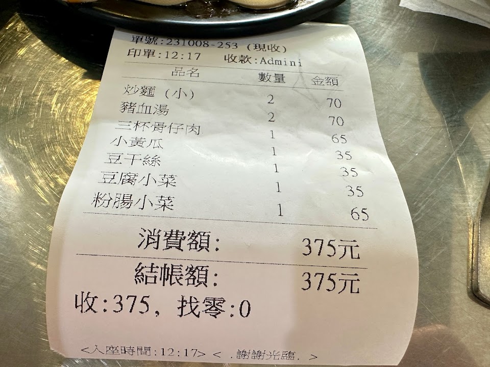 主餐點了炒麵,和一般台中標準的油麵炒倒是一致性,都是豬油口味再依照個人喜好加上東泉辣椒醬。吃起來雖無太大驚艷卻也不至於有扣分狀況。值得一提的是黑白切的處理相當到位;一定來自當天現準備的溫體豬這不在話下,種類和刀工大小也很得宜;可惜當天要點的三杯骨頭肉已售鑿,無緣品嚐稍微重口味的料理如何。