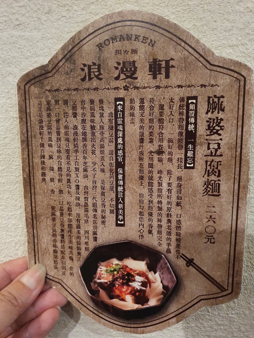 ⭐️⭐️麻婆豆腐麵$260 :褲帶寬麵,比擔仔麵有嚼勁一點,但整體不麻不辣,滿水的