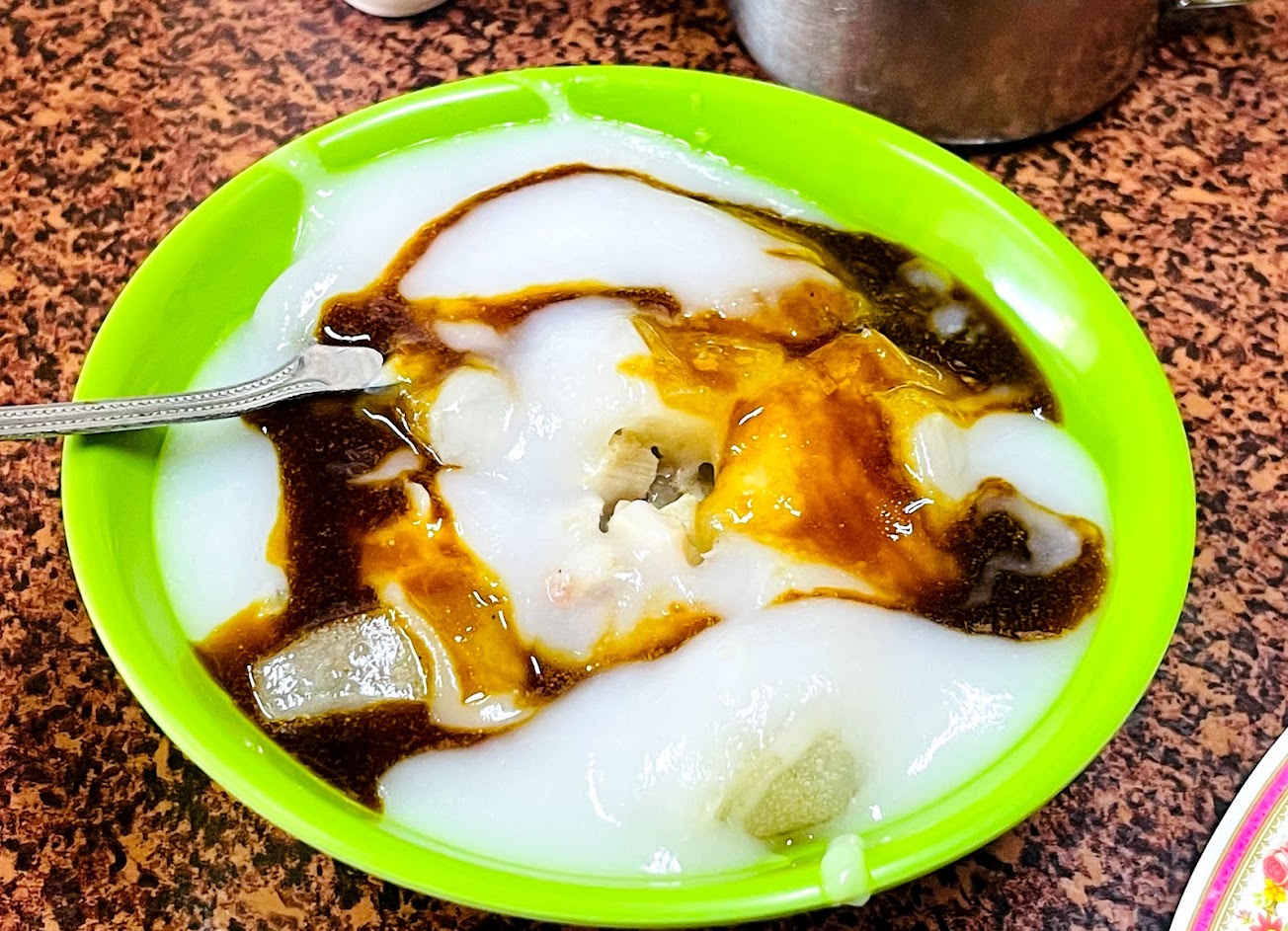 皮非常 Q,醬料味道很特別,像是南部的米醬,但是沒有調色,所以是純白色的。與一般甜醬味道完全不同,吃起來蒜味不明顯,皮也不是炸到脆的口感,肉圓也沒撒上芹菜或是香菜,就是品嚐單純的醬香與肉圓原味。