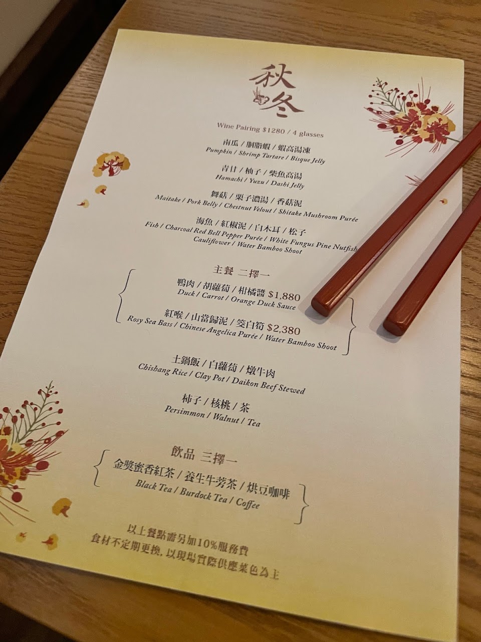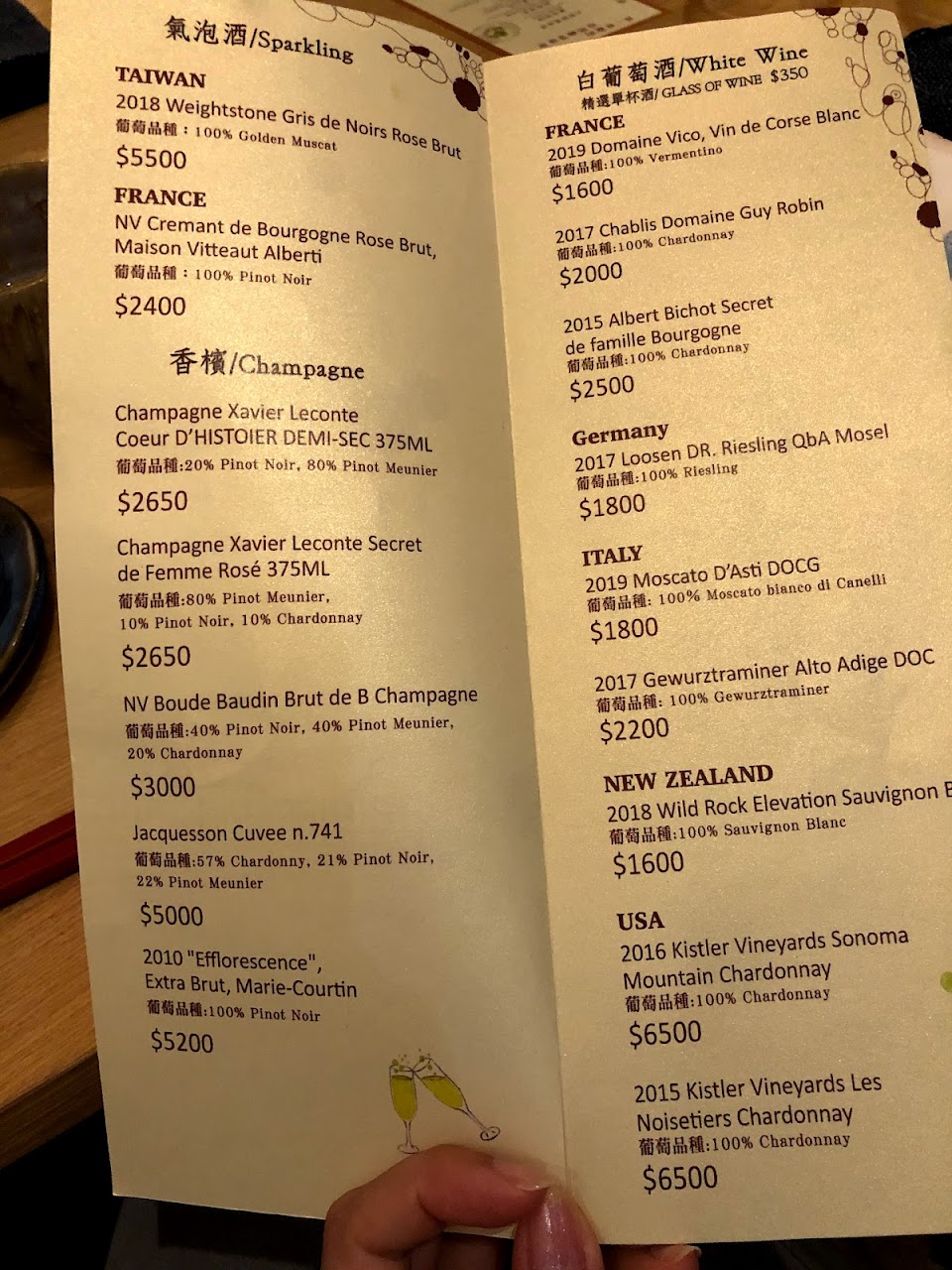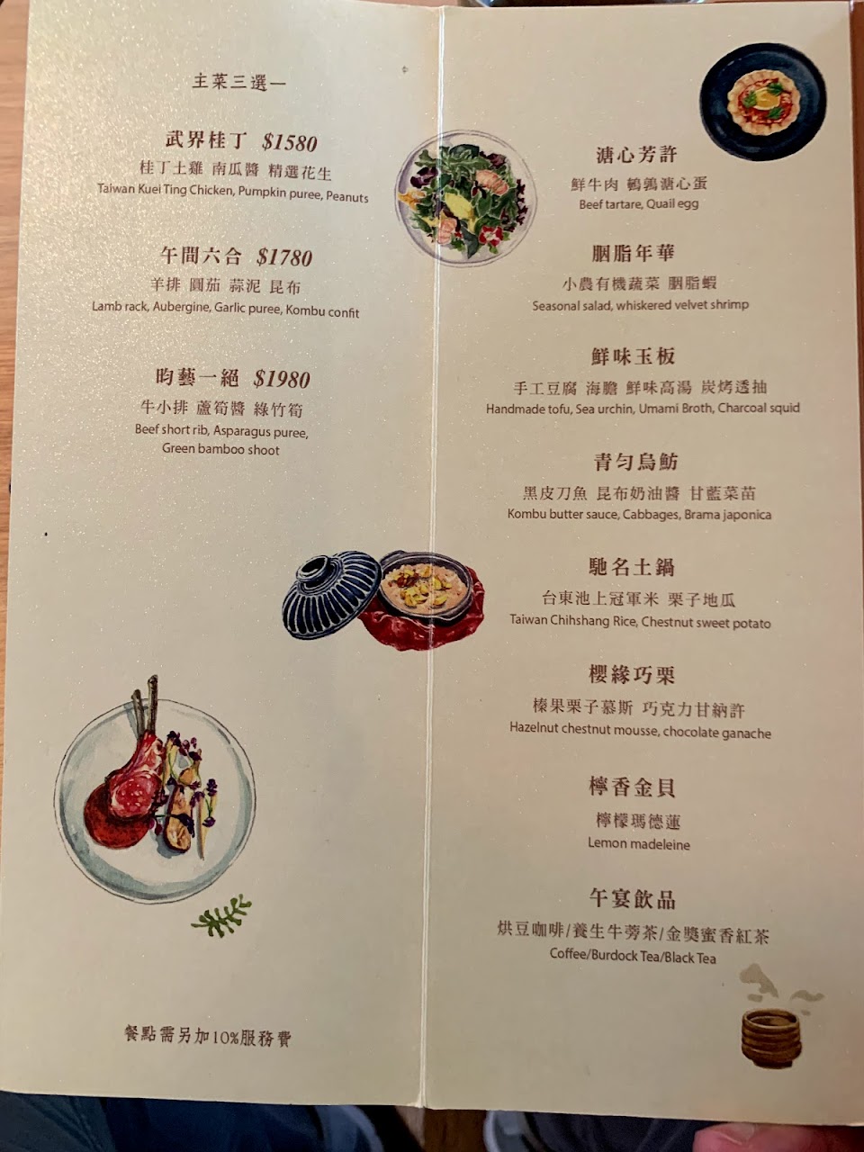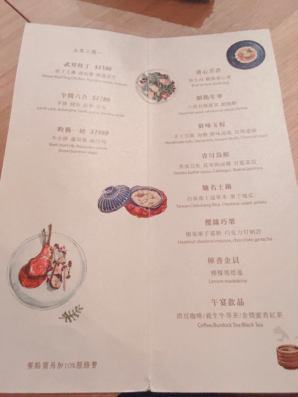 說了這麻多不關食物的讚美,當然是因為食物沒有相應的水準,很可惜?現在愈來愈多標榜創意料理,用台灣在地食材,這點很值得讚許,但,整個晚餐吃完確覺得很落寞?甜點和wine pairing是值到肯定的,其他餐點料理實在是普通?尤其是那乳鴿,我承認,也許是我美食經驗不足,但真不能接受上來的不是可口的脆皮乳鴿?我以為是牛肉,那少少的生鴿肉,料理方式真是委曲了乳鴿?另個菊花布陶鍋飯,雖然服務生優雅的折疊了花布,並打開那雞湯煟栗子飯,但,我們確一置覺得這就是以前農夫耕田隨身帶的布包飯?那飯,四個人一致搖頭,笑說,應該作成燒酒雞飯更好吧!