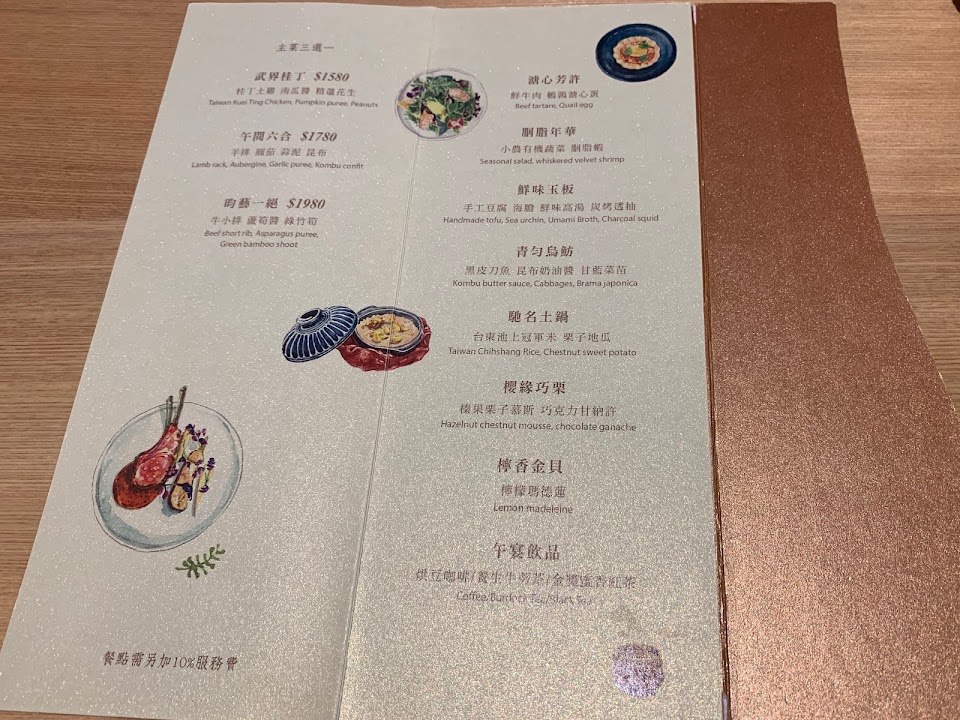 用餐環境清幽,聽著服務人員溫聲細語的介紹,覺得非常親切。餐點使用台灣在地食材,雖然食材本身未必是非常高檔的珍品,然而不論是處理還是烹調手法都非常細膩。熟悉的食材卻驚喜輩出的組合;整體搭配非常均衡,夏季菜單爽口,是紀念日非常推薦的地方。週末兩週前訂位可。