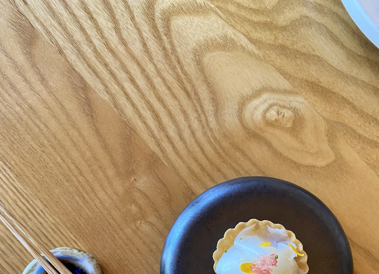 先來說說食物。這邊都是以套餐為主,第一道是冬墨鯤粒,竹炭皮搭配鮭魚卵,因為我不愛生食,所以她們換了水果玉米給我,但我後悔了,我願意為了這道菜吃鮭魚卵,因為這個看起來完全不能吃的竹炭皮,著實是一個貼心且開心的開胃菜。