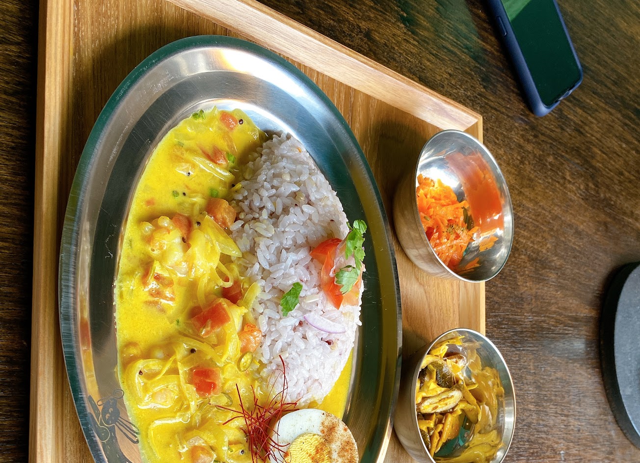 空間舒適,香料咖喱香料味不會過重,鹽味雞肉跟椰汁咖喱都好吃,味道稍重但有助於把飯吃光。但一小碗紅蘿蔔,真的不行啊(紅蘿蔔恐懼症)