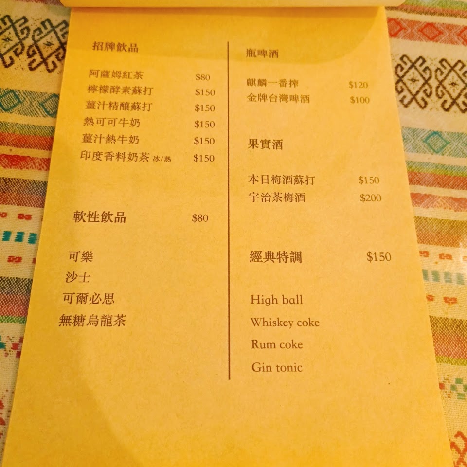 餐點品項稍少,但飲料、調酒品項蠻豐富的,主食只有咖喱飯、其他餐點有雞肉、起司拼盤,覺得稍微可惜。