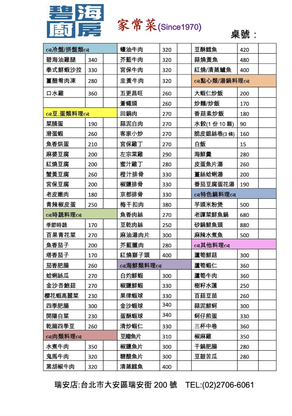 1、地址在大安區瑞安街200號,捷運大安站走路約九分鐘;用餐時間營業,一週七天無公休日。 2、家常合菜餐廳,每道菜價格介於150元到300元之間;東西不錯價格平實CP值高,芋頭米粉煲好吃。 3、碧海廚房前身是圓山碧海山莊(海軍軍官俱樂部),結束營業後改開碧海廚房瑞安店與敦北店;類似的情況還有中央廣播電台的永寶餐廳。