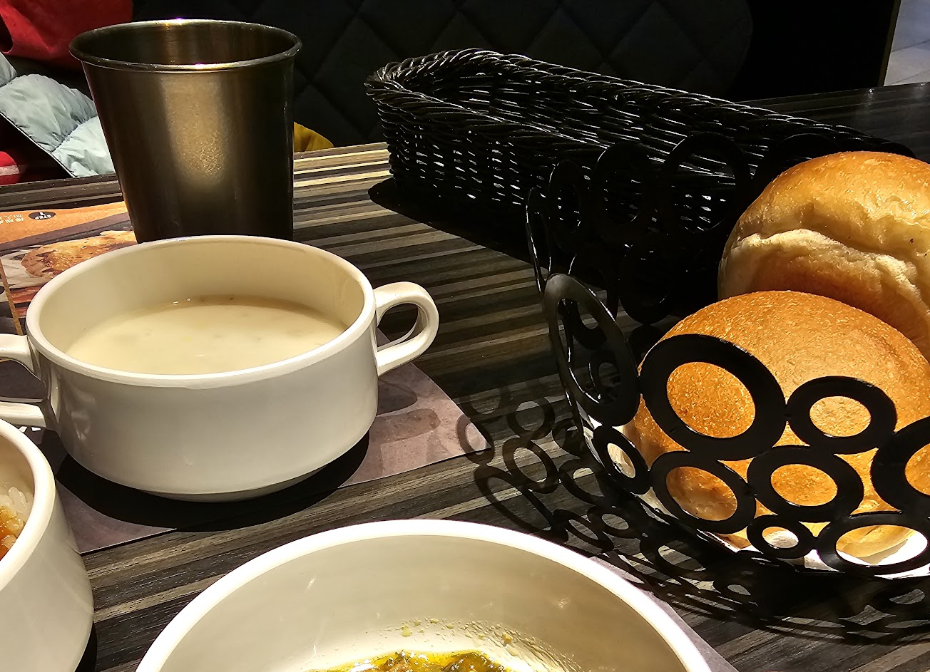 有免費的餐前麵包,自助吧檯有多種冷熱飲料、杜老爺冰淇淋,有白飯自取搭配有咖哩醬和瓜仔肉,還有濃湯跟蔬菜番茄湯。