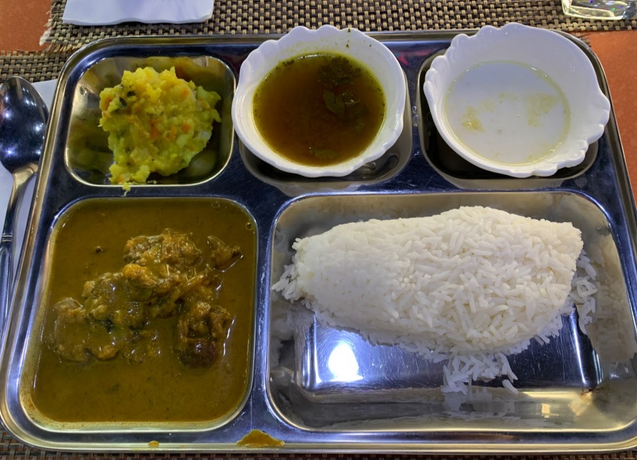 第一次來因為是中午, 所以點了business jouée meal, 印度料理我特別喜歡吃蔬食的, 所以點了個咖哩蔬菜午餐, 用ㄧ個金屬鐵盤裝著, 有湯有甜點, 店家很用心, 白飯是ㄧ個臺灣島的造型~