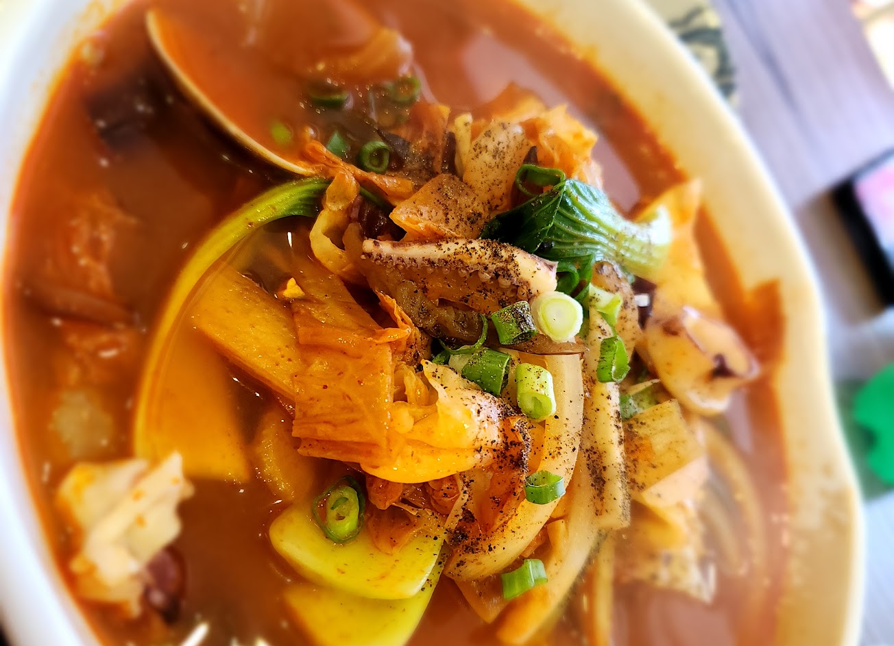 單人部隊鍋,有高麗菜、年糕、魚板、海鮮等配料,除了部隊鍋裡的泡麵還另外附白飯,湯頭也是非常濃郁!吃完非常滿足,非常飽!!